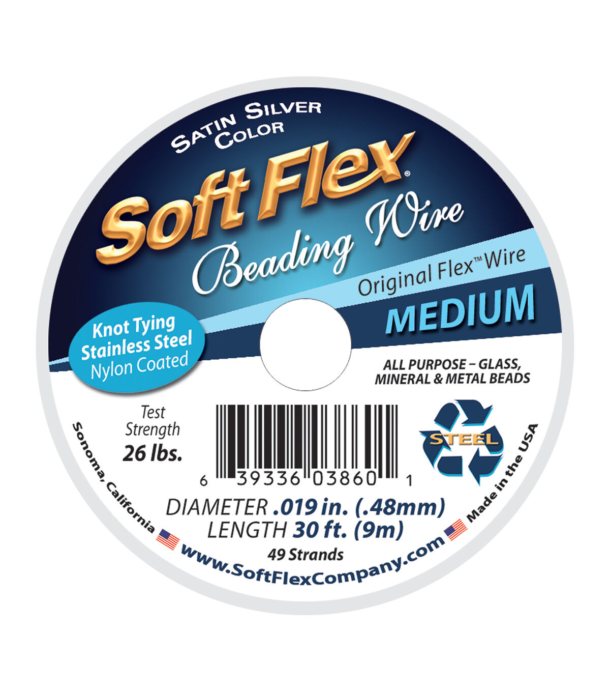 Soft Flex Wire is the designer's choice in bead stringing wire. Soft Flex Wire is a lead-free beading wire for designers that demand strength and durability. Soft Flex Wire is a superior beading wire, created by beaders for beaders. Soft Flex Wire is constructed of either 21 or 49 micro woven stainless steel wires. It is supple enough that it can be knotted and comes in a wide variety of colors. It is available in 3 diameters: .014, .019, and .024. We recommend Soft Flex Wire for designers that want their pieces to last and eliminate the frustration of restringing. Basic Usage: .010 Very Fine - Ideal for embellishing, weaving, crocheting and stringing very small beads. We suggest finishing with 1x1mm crimps. .014 Fine - Ideal for soft materials, seed beads and fresh water pearls. We suggest finishing with 2x2mm crimps. .019 Medium - Ideal all purpose wire. Great with glass, mineral, and metal beads. We suggest finishing with 2x2mm crimps. .024 Heavy - Ideal for abrasive materials, large stones, lamp work and bracelets. We suggest finishing with 2x3mm crimps. Recycle: Empty Soft Flex Beading Wire spools can be recycled. Any customer wanting to recycle empty spools of quality Soft Flex Craft Wire or Soft Flex Beading Wire may mail them to: Soft Flex Company Attn: Recycle, 22678 Broadway - Suite 1 Sonoma, California, 95476