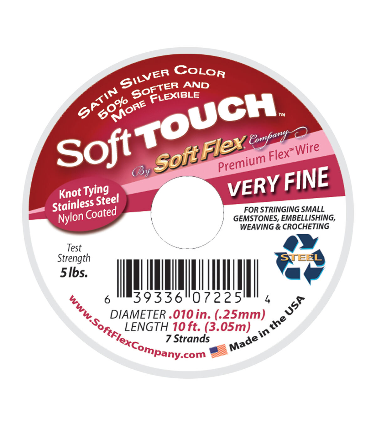 Soft Touch™ Wire is strong as steel and soft as silk. Soft Touch™ Wire is a lead-free beading wire for designers that want a premium product for their designs. Soft Touch™ Wire has the softest drape on the market, your pieces will lay like they were strung on thread. Soft Touch™ Wire is constructed of either 7, 21 or 49 micro woven stainless steel wires. It is supple enough that it can be knotted and comes black and white (.010) and Premium Satin Silver. It is available in 4 diameters: .010, .014, .019, and .024. We recommend Soft Touch™ Wire for designers that want their pieces to last and eliminate the frustration of restringing. Basic Usage: .010 Very Fine - Ideal for embellishing, weaving, crocheting and stringing very small beads. We suggest finishing with 1x1mm crimps. .014 Fine - Ideal for soft materials, seed beads and fresh water pearls. We suggest finishing with 2x2mm crimps. .019 Medium - Ideal all purpose wire. Great with glass, mineral, and metal beads. We suggest finishing with 2x2mm crimps. .024 Heavy - Ideal for abrasive materials, large stones, lamp work and bracelets. We suggest finishing with 2x3mm crimps. Recycle: Empty Soft Flex Beading Wire spools can be recycled. Any customer wanting to recycle empty spools of quality Soft Flex Craft Wire or Soft Flex Beading Wire may mail them to: Soft Flex Company Attn: Recycle, 22678 Broadway - Suite 1 Sonoma, California, 95476