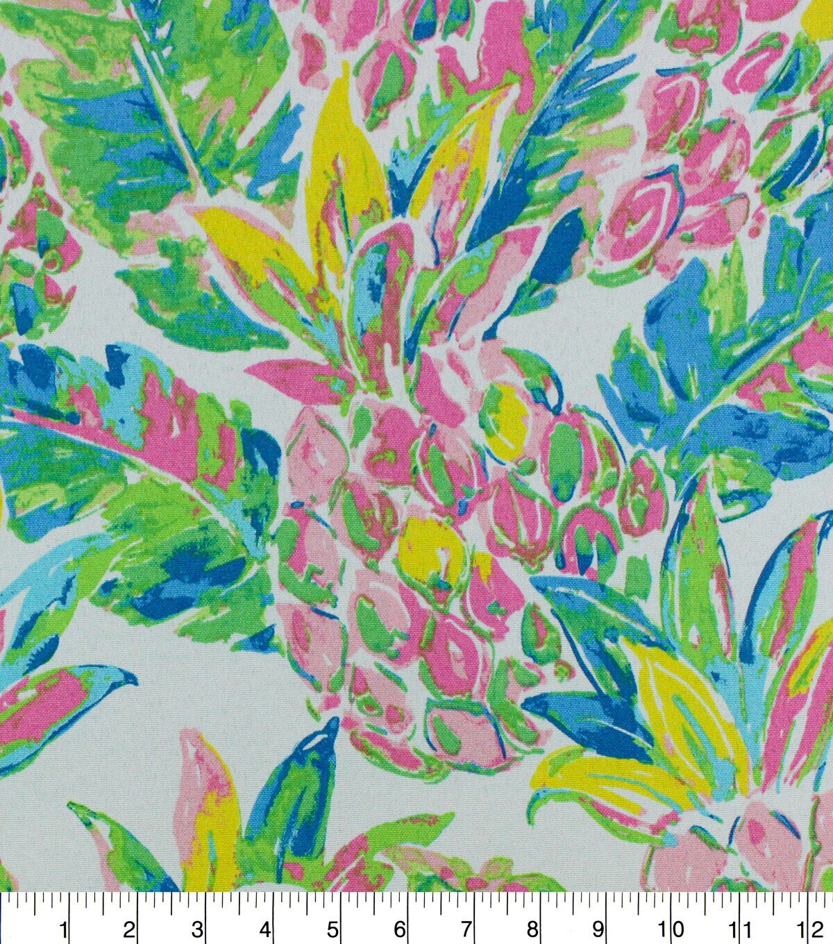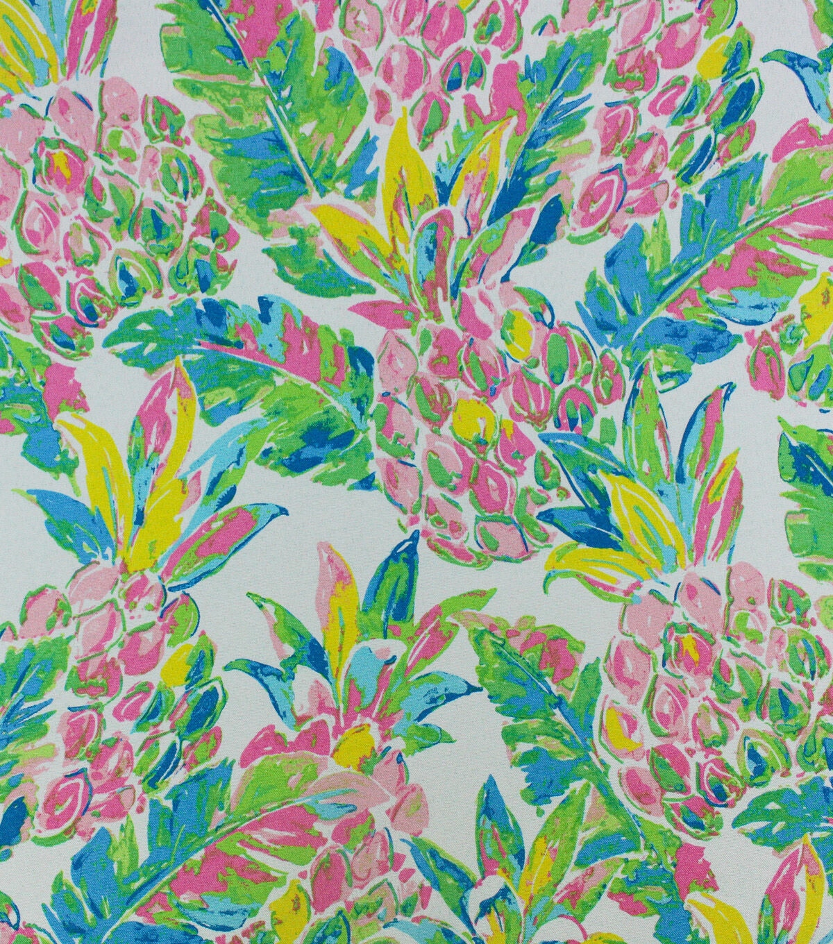 Elevate your outdoor oasis with the stunning painterly pineapple novelty design in happy island pastel shades from Solarium Indoor Outdoor Fabrics. Made from 100% polyester, this outdoor fabric is perfect for creating a cozy and inviting atmosphere for relaxing and entertaining.