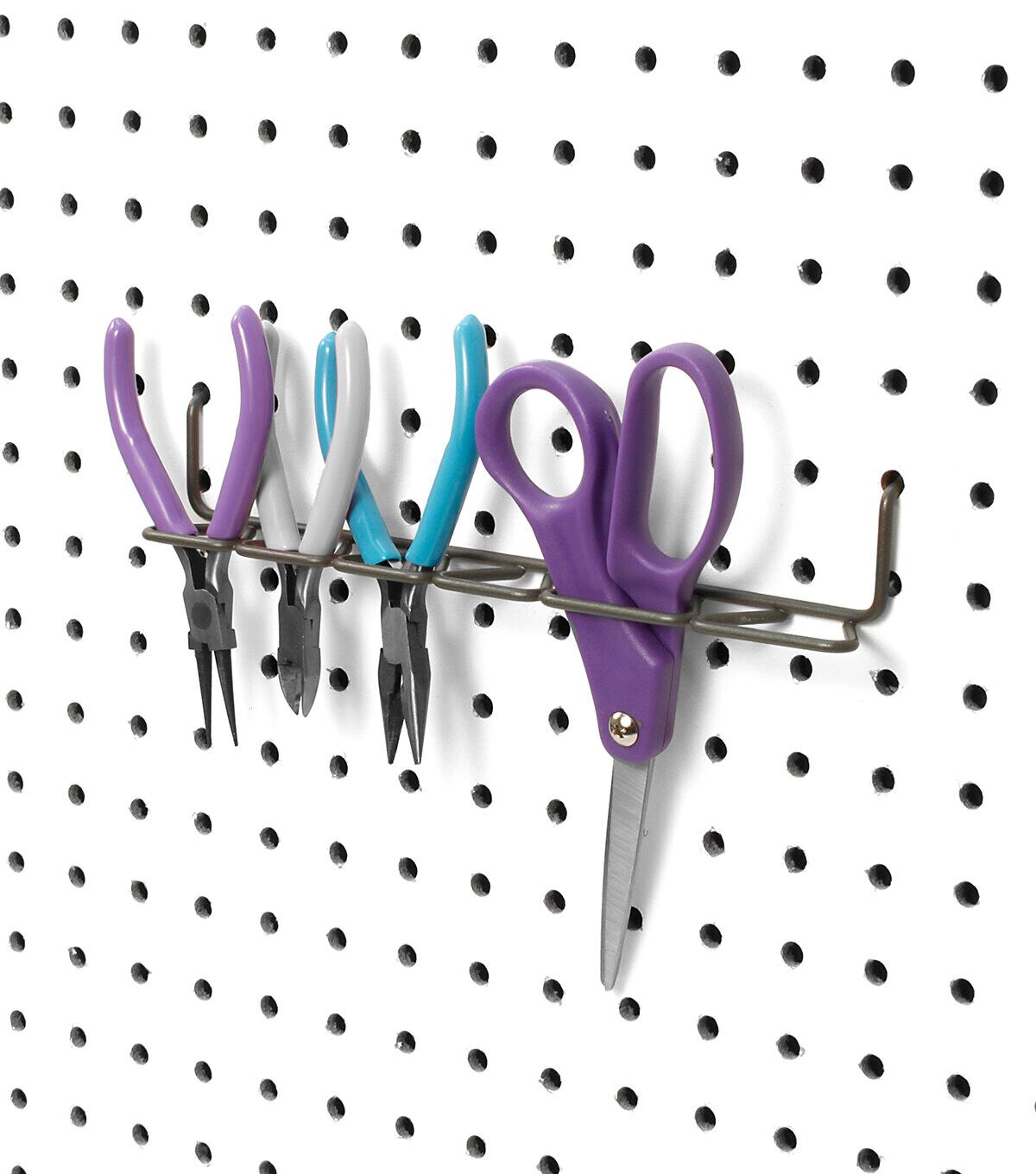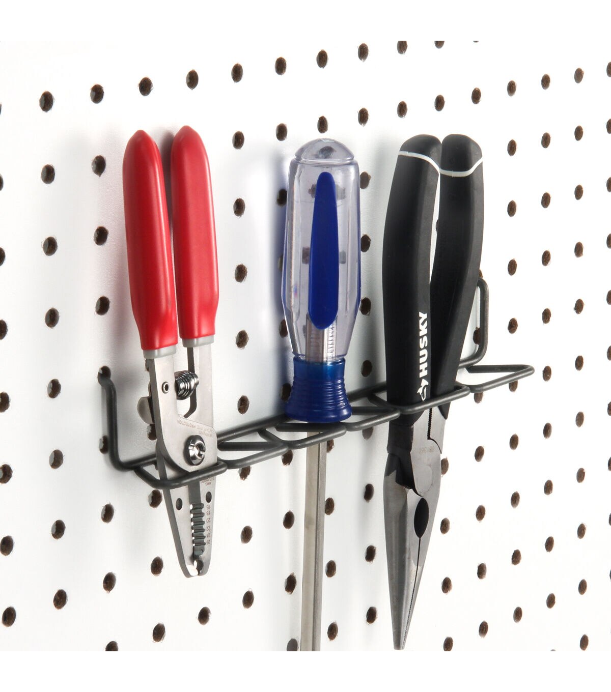 Keep household tools neatly organized and kept in sight with the Spectrum Pegboard Multi-Tool Holder. It holds up to 11 small hand tools such as screw drivers, paint brushes and scissors. Simply slide the tool holder into installed pegboard with 0.25-inch pegboard holes spaced 1-inch apart, center to center or slat wall for quick and easy storage. Made of sturdy steel, it's perfect for the garage, workspace or craft room.