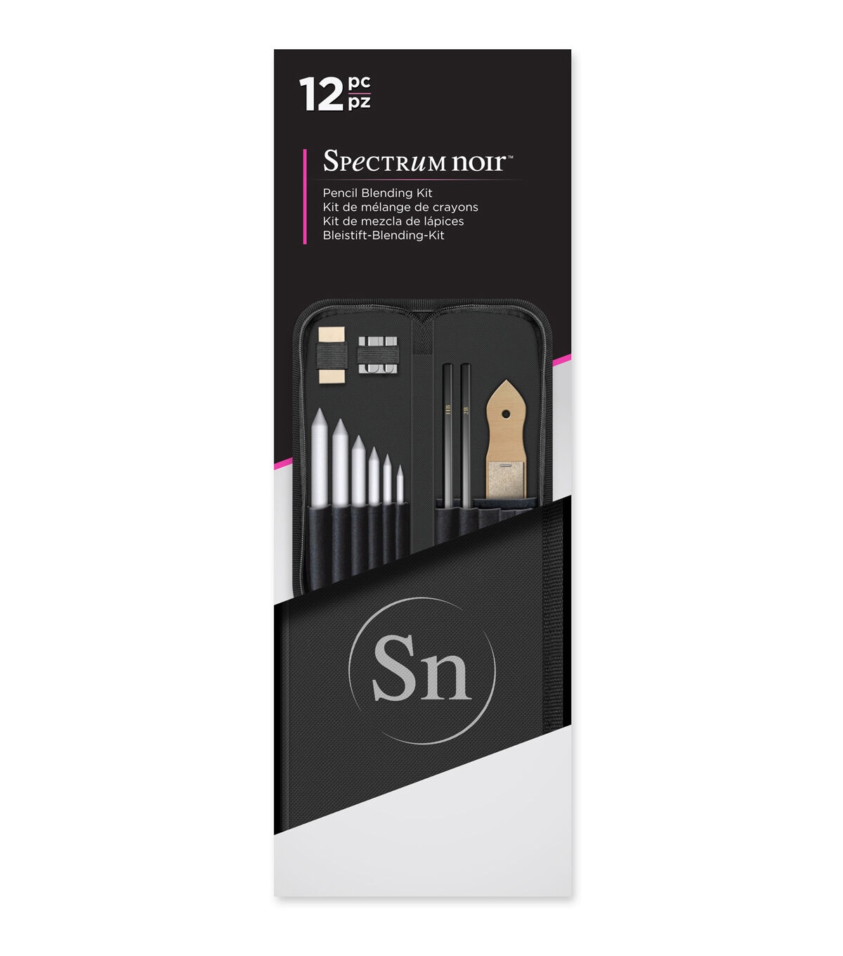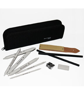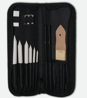 This Pencil (paper stumps) Blending Kit is designed by Spectrum Noir for Crafter's Companion. This kit includes six sizes of blending stumps, a sanding paddle with 12 sheets of sandpaper, two sketching pencils, a double-hole pencil sharpener, and a soft eraser, and it all comes in a zippered case.
