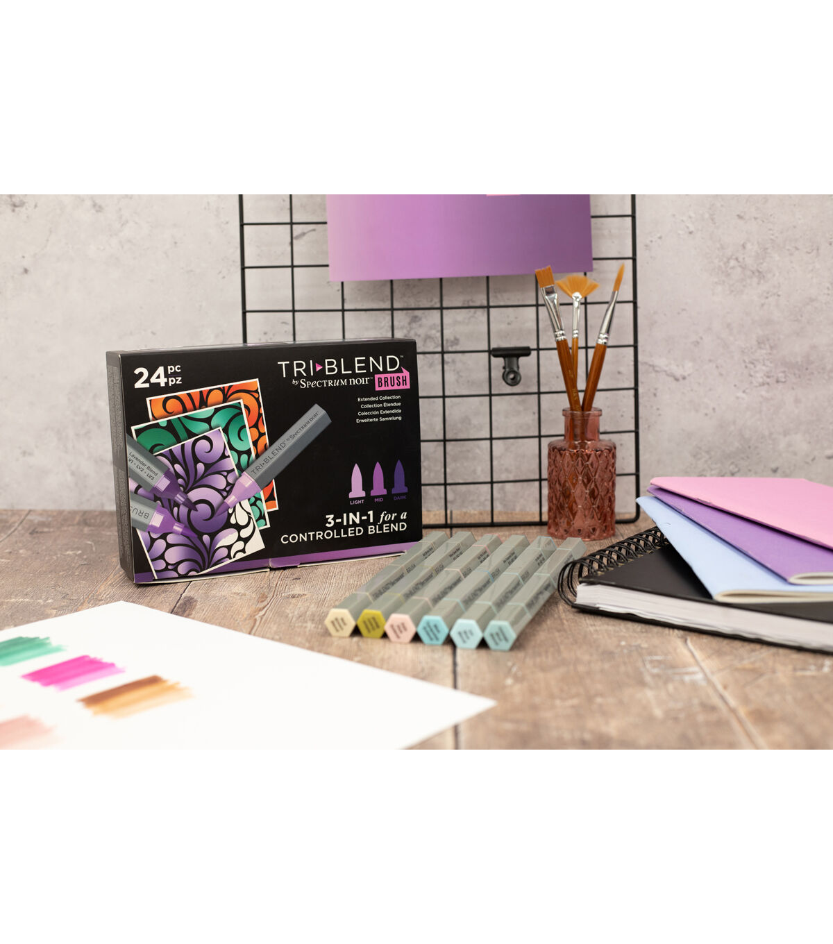 Expand your artistic horizons to create, shade and blend with a new palette of colours and combinations with the Spectrum Noir TriBlend Brush 24-piece Set! This collection of premium Spectrum Noir TriBlend Brush Markers includes 12 brand new colour groups - offering a new opportunity to broaden your art and colouring scope! There are also 12 new colour combinations, designed to complement the existing TriBlend Brush range. Each marker includes three blendable shades, designed to combine perfectly for seamless blended effects, plus stunning depth, and dimension. The Japanese fibre brush tips offer smooth flexible sweeps of color for a more expressive and artistic feel. These brush tips create more expansive coverage than classic fine tips and offer the opportunity to try out new techniques such as flick blending.