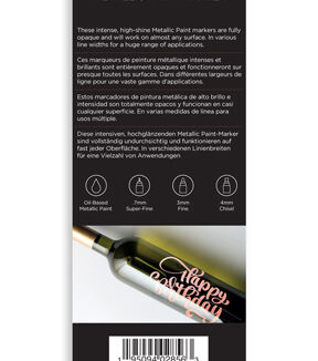 These rich oil-based Metallic Paint markers from Spectrum Noir are reflective and fully opaque, making them ideal for all kinds of decorative and mixed-media use. Each set includes three multi-purpose nib styles for writing, embellishing and general creative work. Suitable for use on paper, card, canvas, glass, wood, plastic, metal, rubber, ceramic, stone, and most surfaces. The oil-based formulation is non-toxic, waterproof and weatherproof. Metallic Paint markers work especially well on darker surfaces where their intensely opaque reflective effects can really stand out.