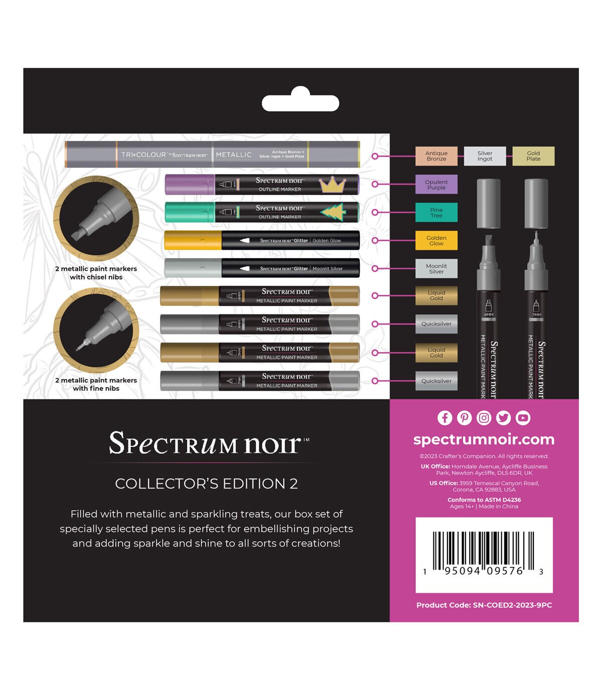Customise, embellish and let your creativity shine bright with the Spectrum Noir Collector’s Edition Two. This set of nine speciality markers has everything you need to decorate your creative projects with shimmering metallics, dazzling sparkle and truly unique effects!