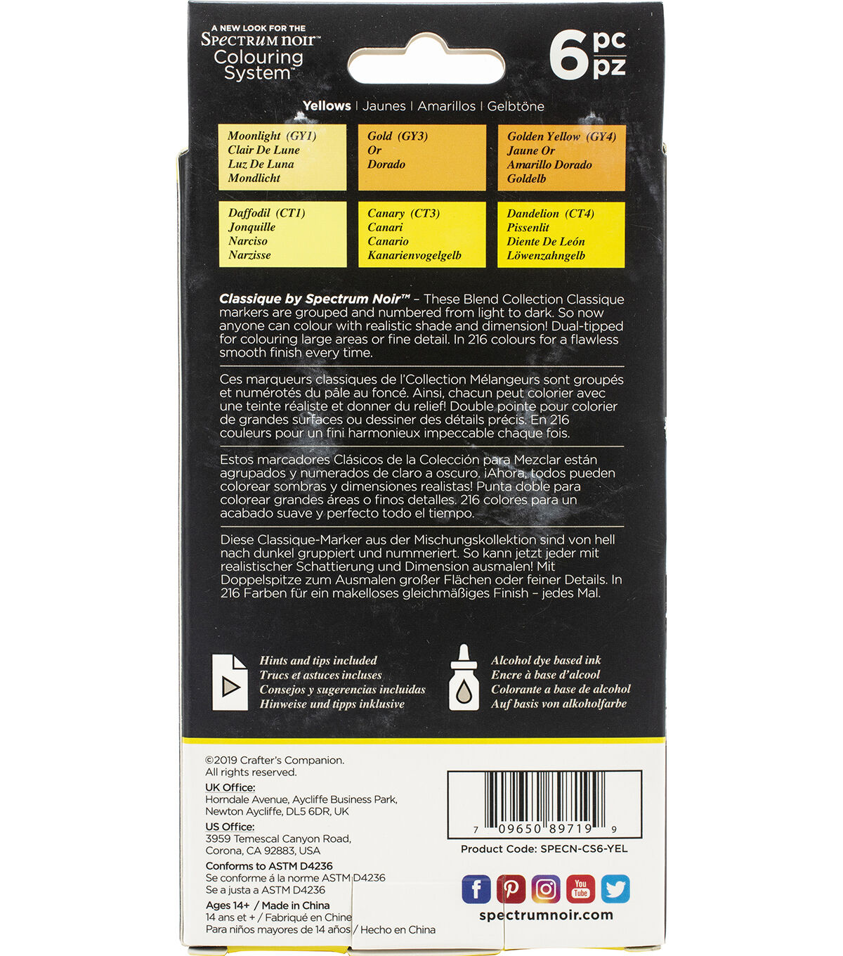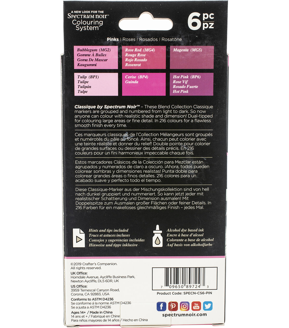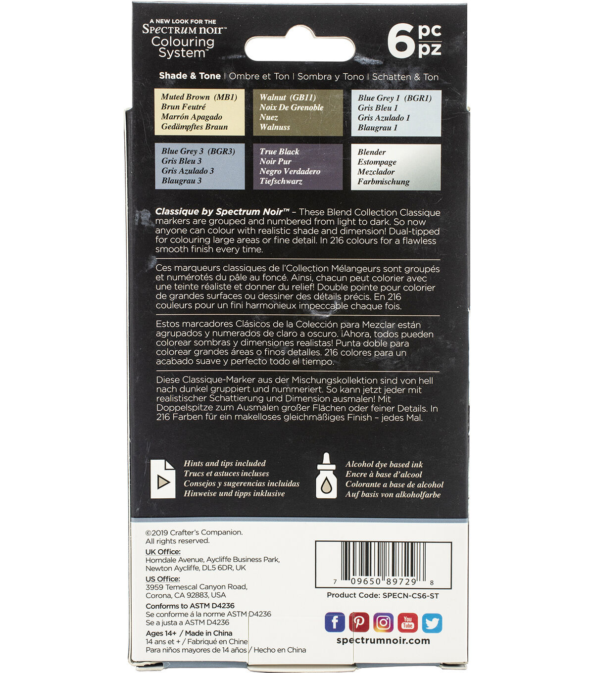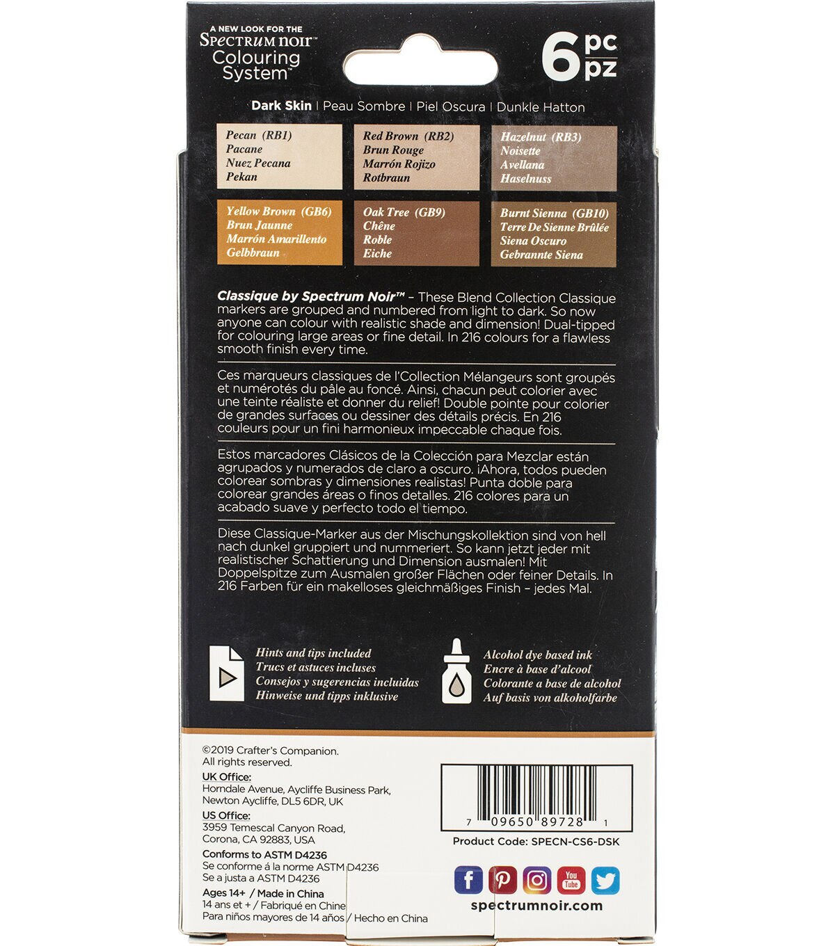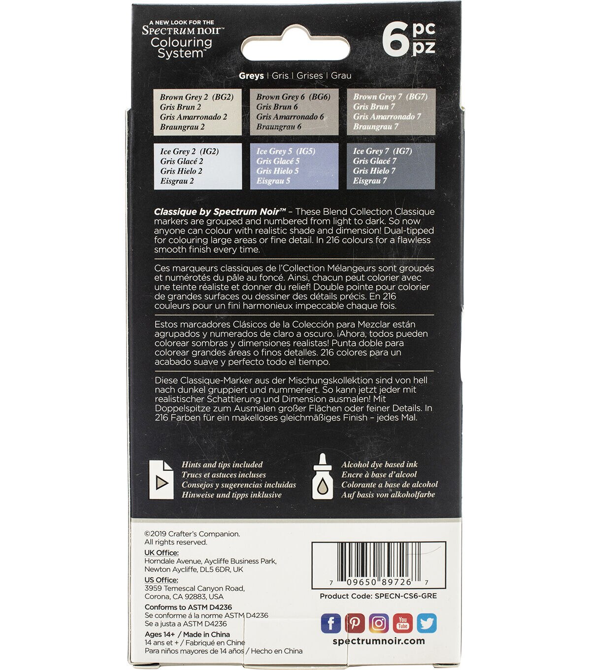 Spectrum Noir alcohol based markers provide unique groupings of colors that work together well and provide subtle shadings within color families. These professional high quality pens are double-ended, with a broad chisel nib for large area fills and a fine bullet tip for detailed work. End caps are colored for easy identification. Two-tip construction provides flexibility in line widths. Non-toxic, fast drying and will not bleed.
