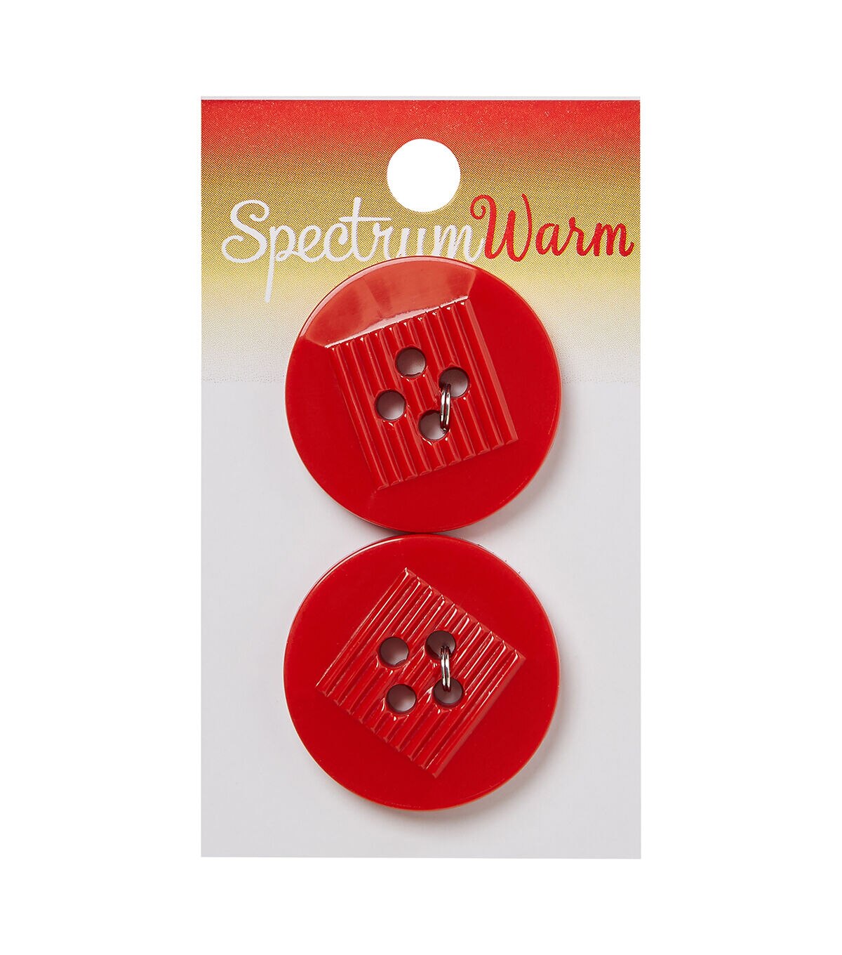 The Spectrum Warm Buttons- Red Geometric will make a unique addition to your collection. This pack contains two bright red buttons that are embellished with a striped square accent. Use them to fasten a cute little skirt, create a smart side closure top or stylize a handmade tote. Pair them with other buttons in contrasting shades, sold separately, to up the style quotient of DIY apparel sewing and papercrafting projects.