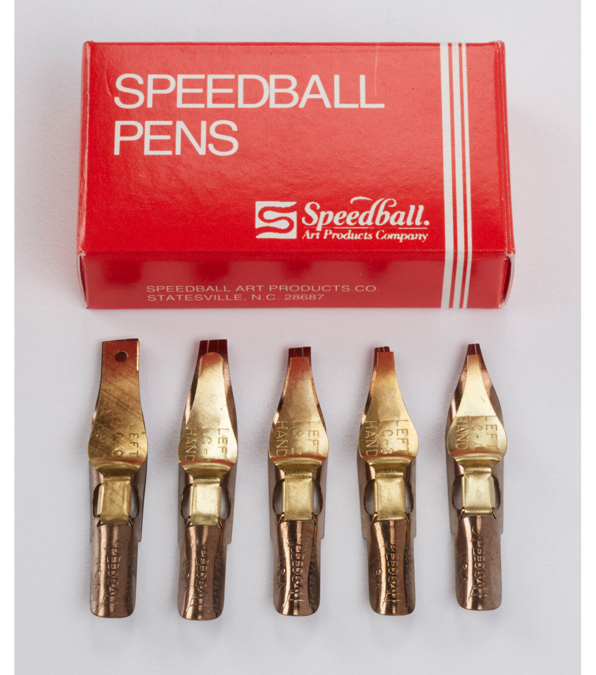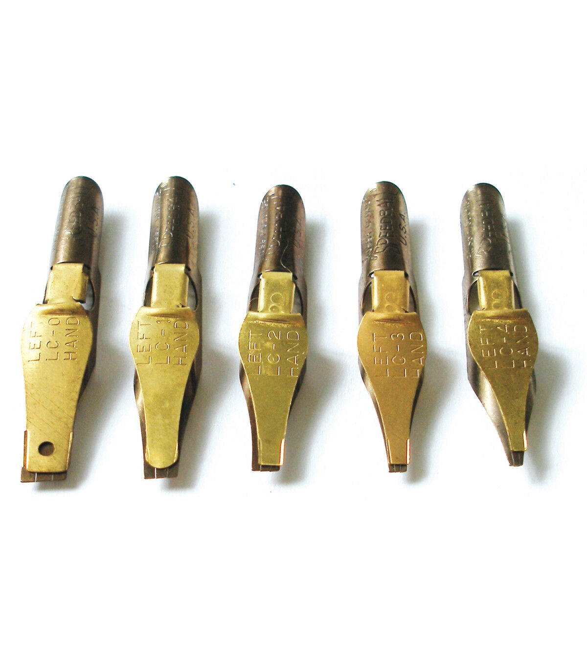 The C Series Nibs feature a traditional broad edge nib with a great degree of flexibility. Each nib is meant to be held at a constant angle throughout the creation of any traditional calligraphic alphabet (with minor variations needed, depending upon the lettering style). This consistent angle gives the lettering artist the desired thick and thin strokes usually associated with broad edge calligraphy, such as Roman, Carolingian, Uncial, Italic, Gothicized Italic, Blackletter or Neuland. This set includes five C Style left-handed pen nibs, sizes (0-4), one of each size.