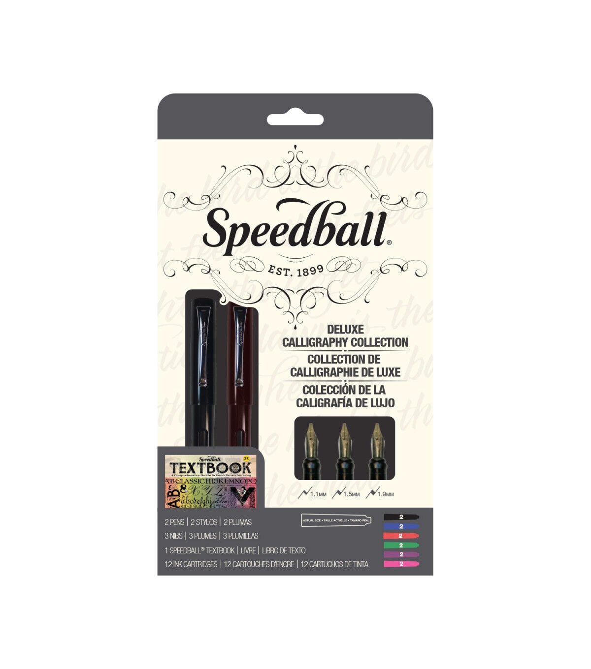 Whether for an aspiring calligrapher or simply an appreciator of beautiful writing, Speedball's Calligraphy Fountain Pen Master Set contains the complete range of Speedball Fountain Pen offerings, a line that perfectly combines comfort, performance and value. This 18-piece set includes two Speedball Calligraphy Fountain Pens, three Fountain Pen Nibs (1.1mm, 1.5mm, 1.9mm), 12 Ink Cartridges (two each of black, blue, red, purple, green and pink) and an excellent resource for lettering instruction, The Speedball Textbook.