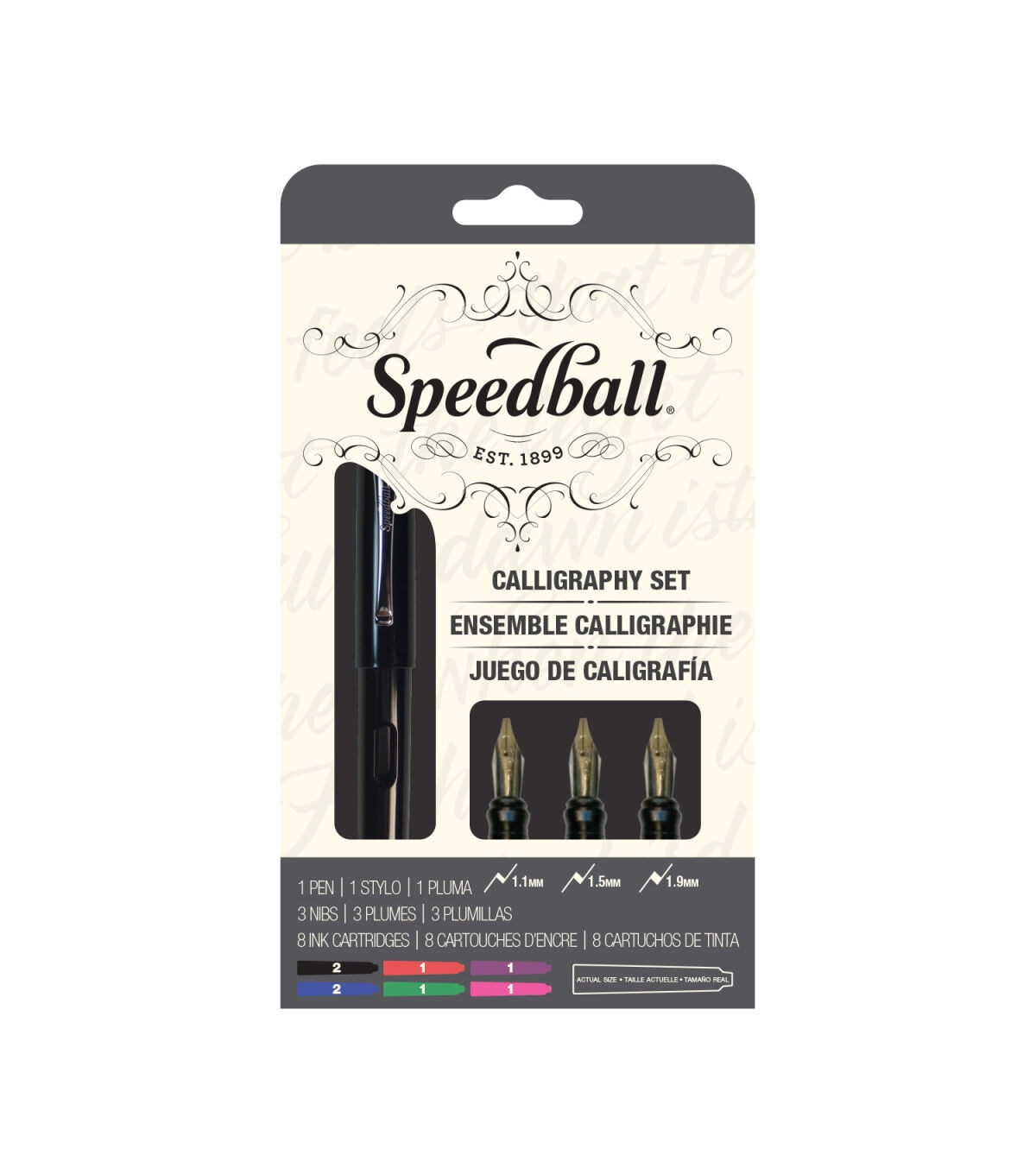 Whether for an aspiring calligrapher or simply an appreciator of beautiful writing, Speedball's Calligraphy Fountain Pens offer the ideal combination of comfort, performance and value for artists, hobbyists and enthusiasts alike. Enjoy a superior writing experience that artists to create beautiful results with ease. This 12-piece set includes one Speedball Calligraphy Fountain Pen, three Fountain Pen Nibs (1.1mm, 1.5mm, 1.9mm) and eight Ink Cartridges (two each of blue and black, one each of red, purple, green and pink).