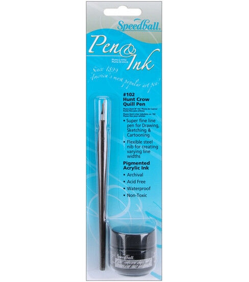 SPEEDBALL-Pen and Ink. America's most popular art pen since 1899! Superfine #102 Crow Quill pen nib and holder packaged with a 12ml jar of Speedball's acid-free, archival quality pigmented acrylic ink. Waterproof and non-toxic: conforms to ASTM D4236. Color: Black. Made in USA.