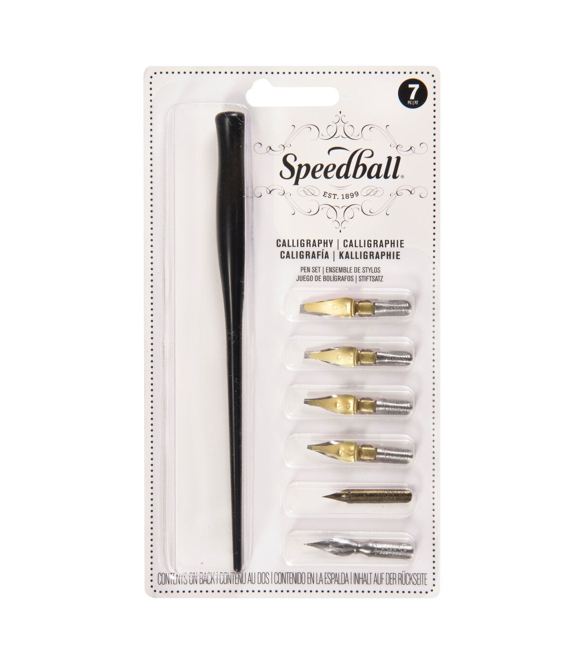 For beginners, this set includes four C style pens and two Hunt pens for fine work, plus a Speedball penholder.
