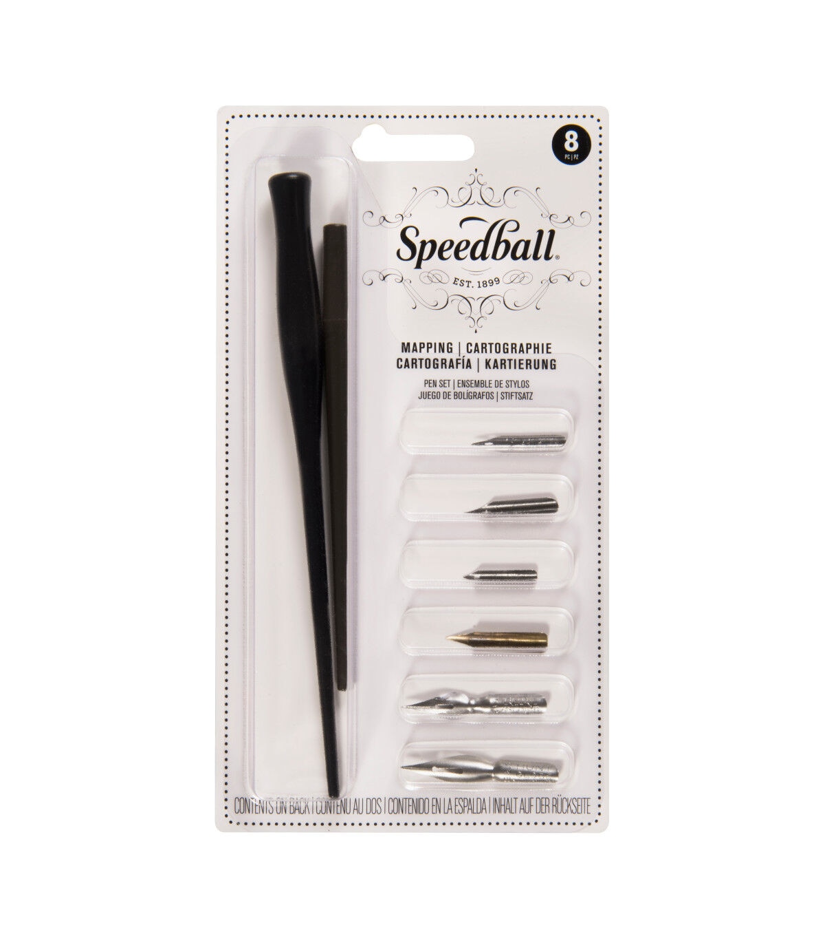 SPEEDBALL ART PRODUCTS-Mapping Pen Set. This set of nibs and pen holders is ideal for artists looking to create mapping and fine line mechanical drawings. Included in the set are two pen holders, six nibs (styles 99, 100, 103, 104, 512 and 513EF), and an instruction booklet with helpful tips on lettering and drawing methods. Made in USA.
