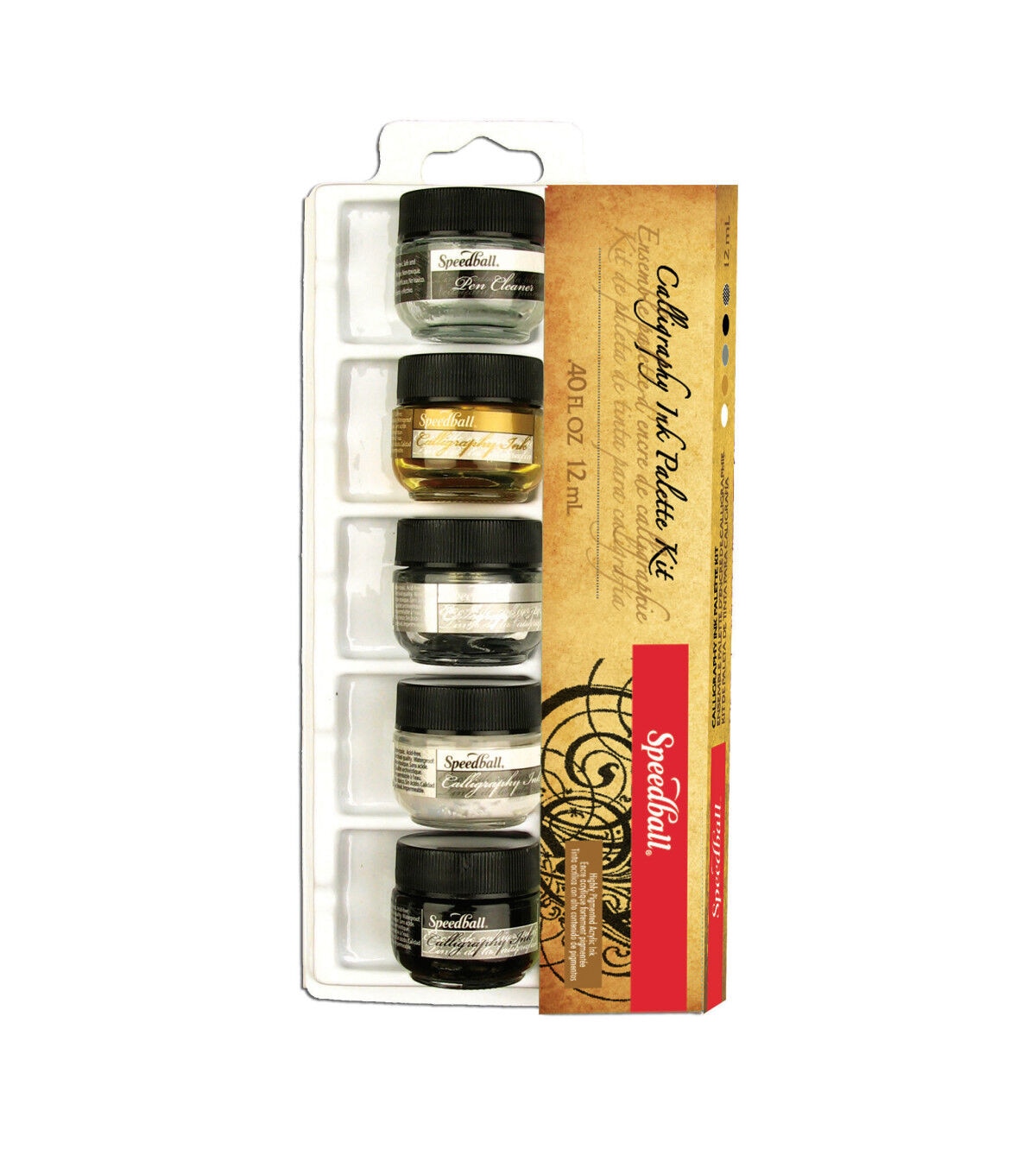 The artist of any skill level will appreciate the rich, vivid colors of the waterproof and permanent pigmented acrylic ink found in this set. This 5-color set contains black, gold, silver, white and pen cleaner in a five-well plastic palette with pen/brush rests. The ink is perfect for drawing, calligraphy, painting, stamping and airbrushing.