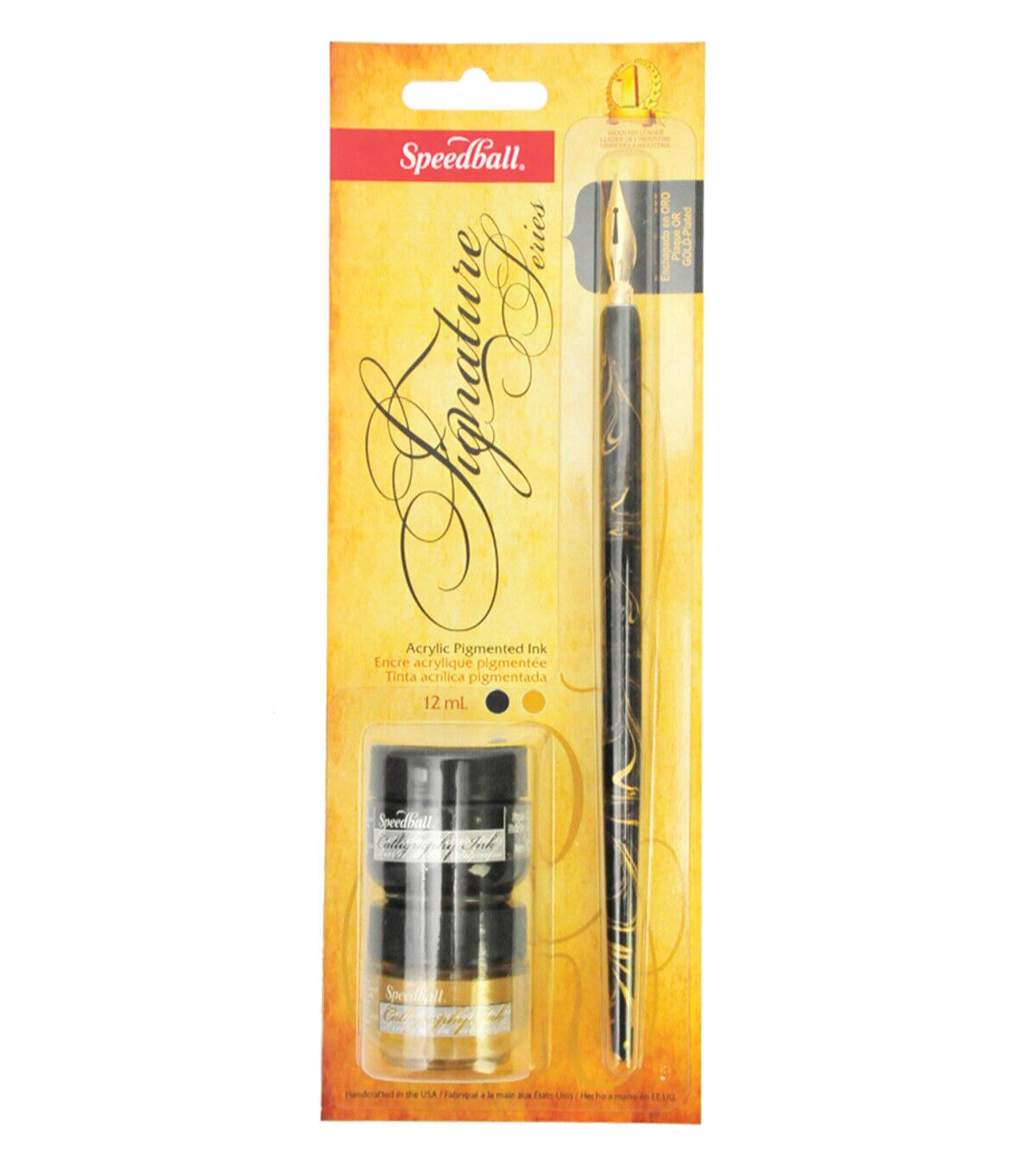 Whether you are just discovering the joy of calligraphy or you are well-versed in ascenders and descenders, this set is sure to delight and inspire. The Signature Series offers artists a beautiful gold and black marbled pen holder with a handcrafted, gold-plated steel pen nib. The set also includes two 12ml bottles of highly pigmented acrylic ink.