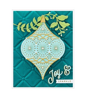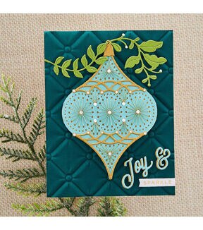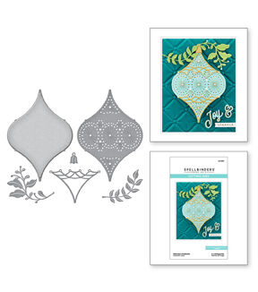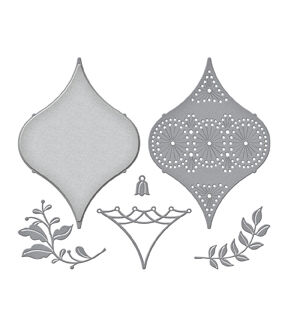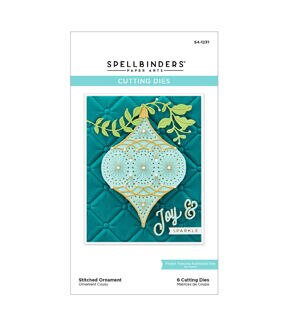 Stitched Ornament Etched Dies from the Stitchmas Christmas Collection. The set of six thin metal cutting dies creates a stunning teardrop shape with its detailed ornament insert die. It even comes with topper and sprig motifs to hang on. The dot designs are a guide to stitch the patterns with embroidery floss and needle. Use the designs as is because the embossed lines act as faux stitched details.