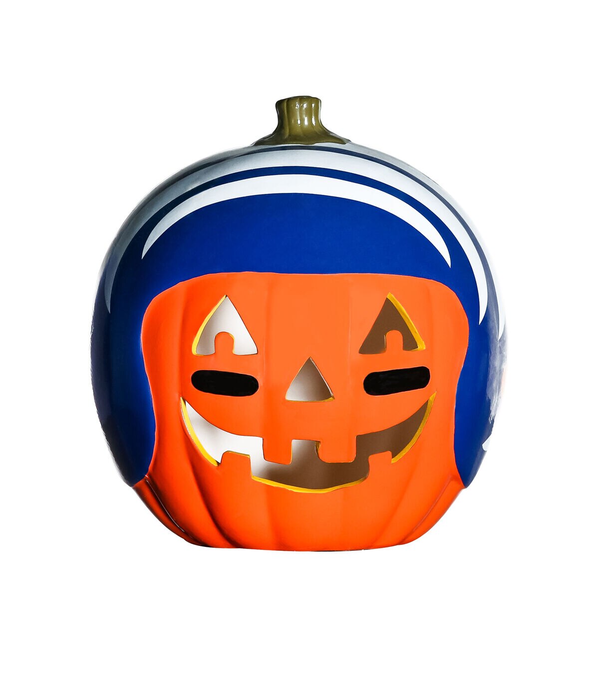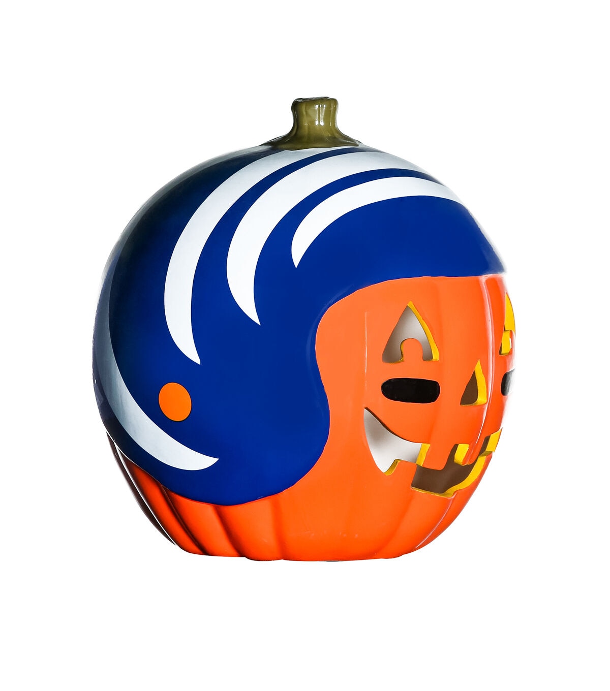Decorate for fall and football season with our exclusive hand painted 10” Team Pride Ceramic Pumpkin Helmet!  This adorable ceramic features a jack-o’-lantern face with logo graphic helmet.  Perfect for your front porch or kitchen island!!  Bottom access allows you to add a tea light or flameless candle. (not included) Display alone or Teamscape with our Team Pride Color Mum. The ideal gift For the Deep Rooted Fan!