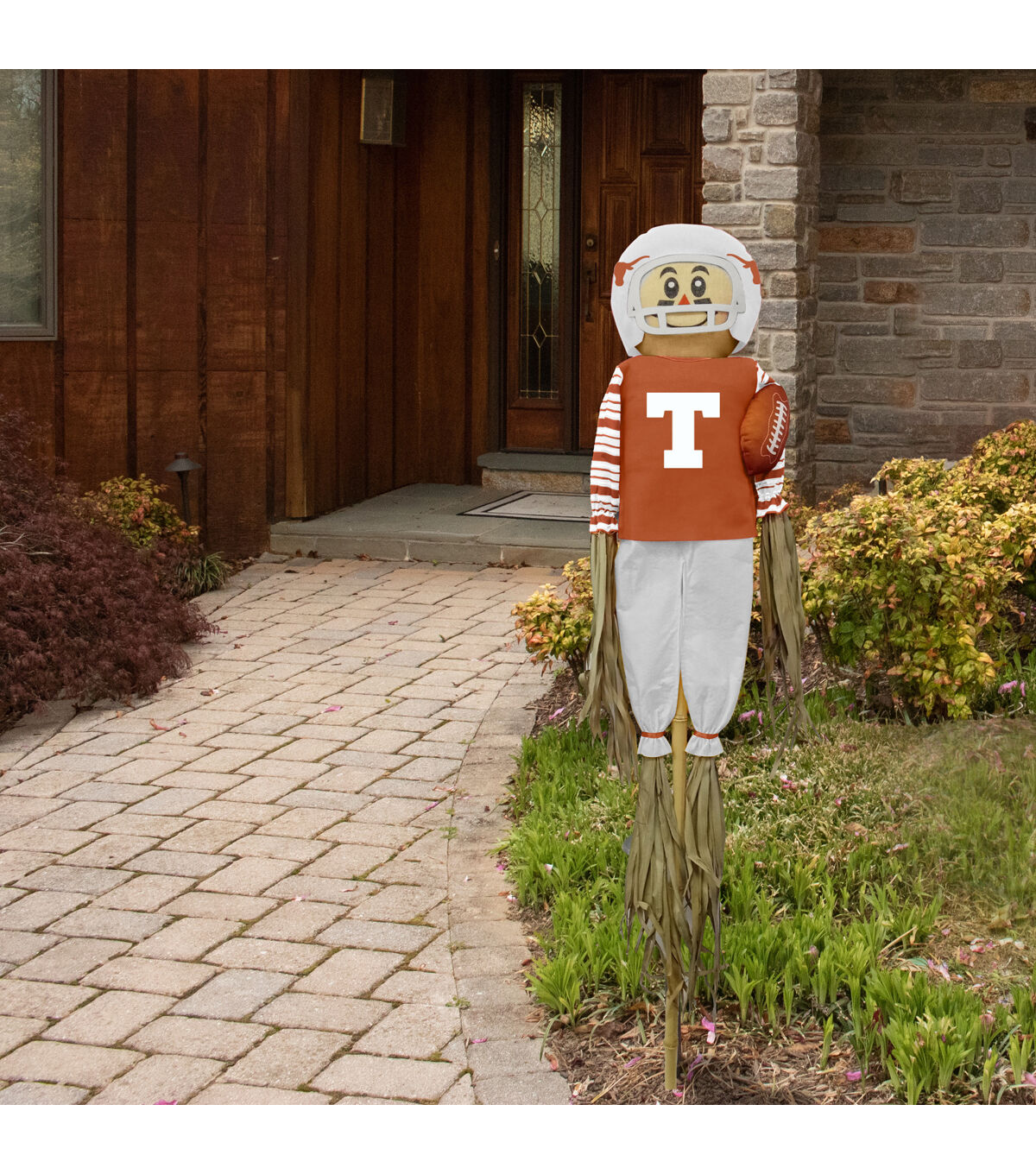 Teamscape this season with the adorable Team Pride Scarecrow. This 5 foot officially licensed football player scarecrow is perfect for a front yard, garden, or tailgate decor! Complete with its team inspired uniform, football, and integrated pole, you are sure to be the envy of the neighborhood all season long. Makes a great gift For The Deep Rooted Fan