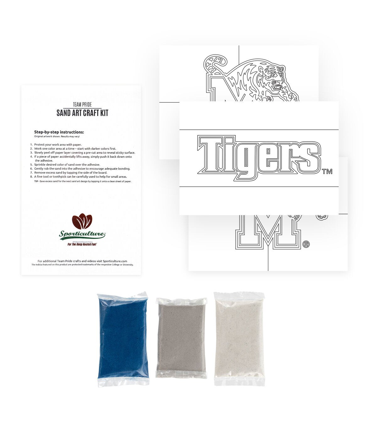 Create sparkling sand inspired fan art with the Team Pride Sand Art Craft Kit! Simply peel back the precut pieces to reveal the sticky board design of your favorite team’s name and logo and sprinkle the Team Color Sand to each area! Sand will adhere to the sticky board creating one-of-a-kind art! An easy craft that requires no cutting or gluing! Makes a great activity for gameday celebrations or outdoor tailgates! Includes 3 boards and Team Color Sand! Details and Dimensions: Officially Licensed Approximate Product Dimensions: 5” x 7” Package Dimensions; weight: 10” Length x 7” Width x .5” height; weight 1pound 2- 5”x7” Team Logo Peel and Stick Boards- Logo Design 1- 5”x7” Team Name Peel and Stick Boards -Team Name Design 3-6 2oz bags of Team Color Sand sorted (quantity may vary) Materials: 100% pure sand-contains no free silica or quartz Easy-to-follow instructions Ages 5 and up Made in Canada Product Care: Smaller areas and details might be difficult to peal by hand. Use a toothpick or sharper type tool carefully to remove. Product Warning: Ages 5 and up (Adult Supervision Recommended)