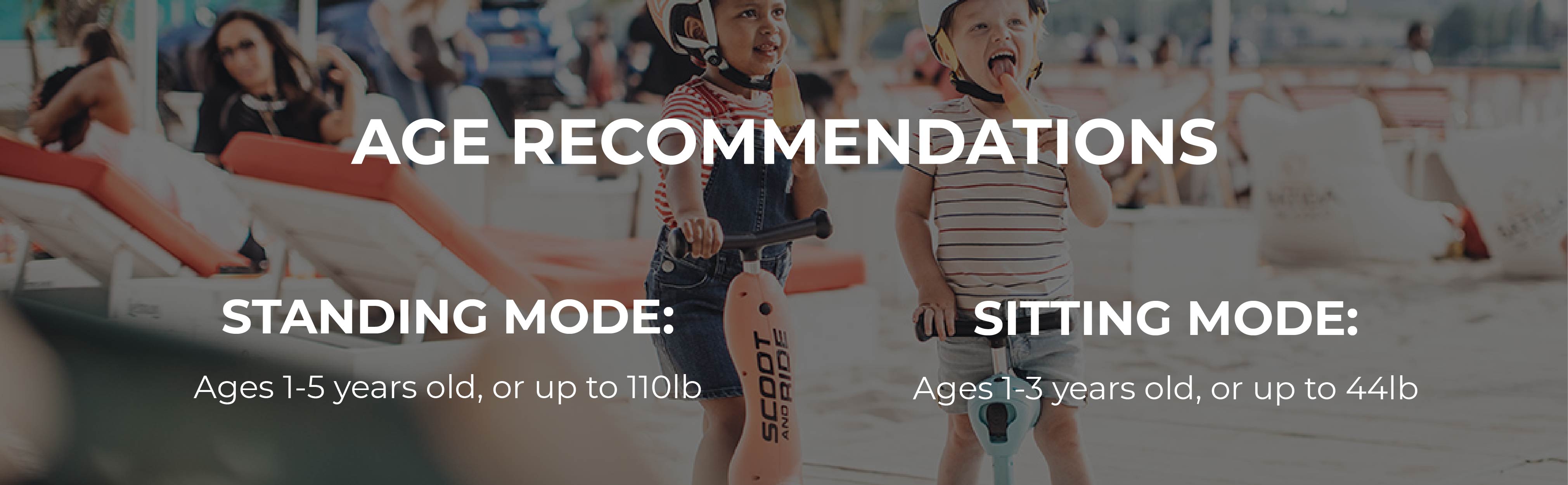 AGE RECOMMENDATIONS: sitting mode recommended for children between 1-3 years old, or up to 44lb. Standing mode recommended for children between 1-5 years old, or up to 110lb.
