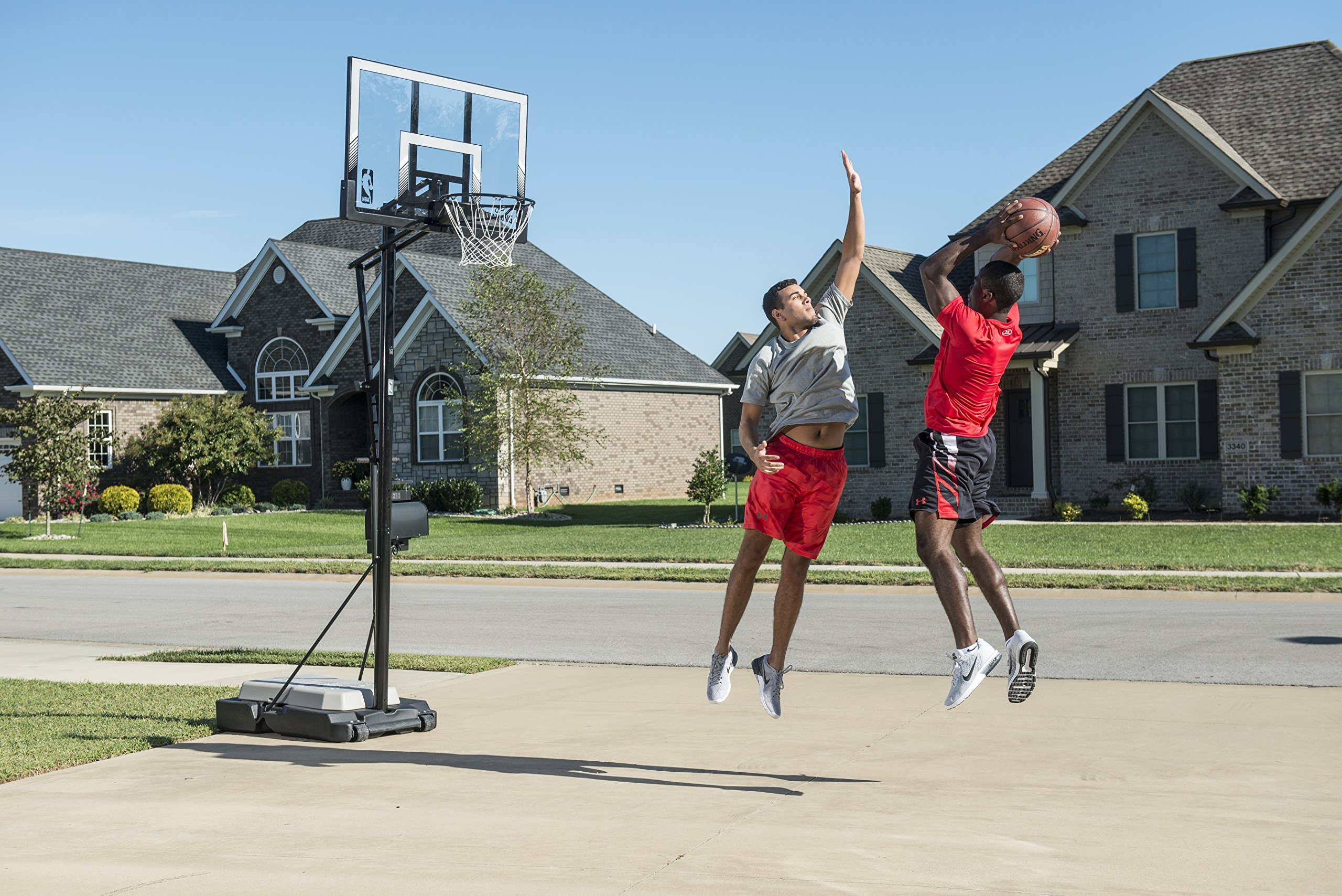 Designed for competitive level of play, the ultimate hybrid Jr portable Basketball system will transform the pavement into an arena. The hybrid base with its removable lid for easy storage access holds 11 gallons of water and 200 lbs (4ea 50lbs bag of sand) of sand or gravel. The acrylic backboard allows for fast rebounds - great for bank shots and forward players. The heavy duty Arena-Slam rim features breakaway action with steel Rams to attach the White net (included). quick glide lift system adjust rim height from 8.0" - 10" in 6" increments. Other features include a three-piece, 3-Inch steel pole, and a NBA authentic style blow-molded backboard pad and NBA pole pad that provides added protection.