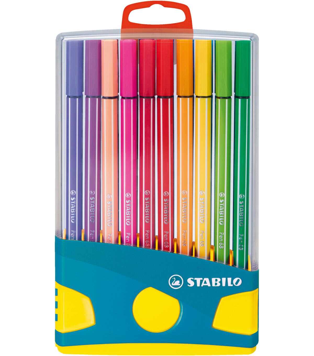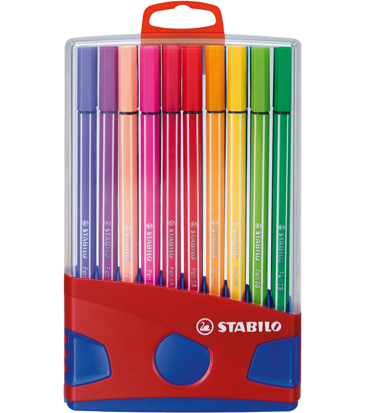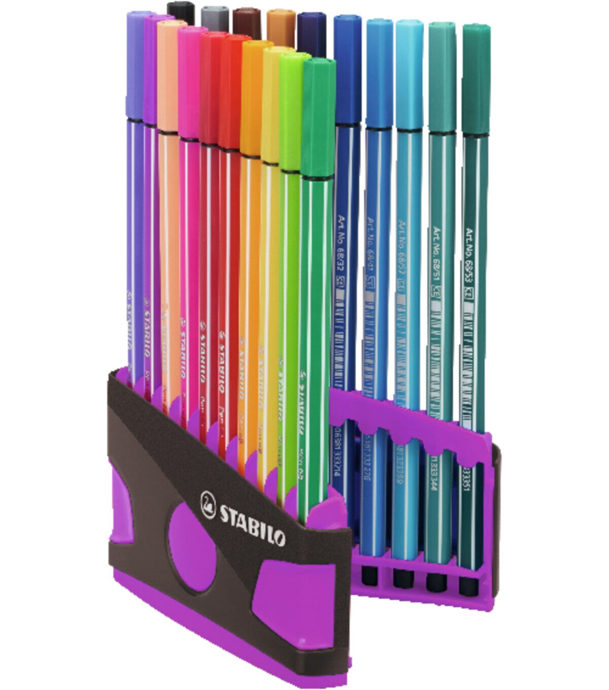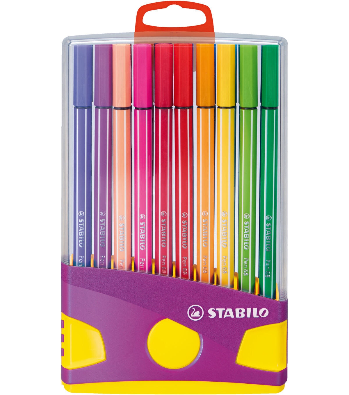 This sets includes 20 pens in vibrant colors that come in a convenient plastic case. The case folds out into a fun stand-up easel making it easier to choose pens and keep them organized. With their sturdy bullet tips and brilliant, intense colors, Pen 68 fiber tip pens are perfect for layout, detail and sketching. The odorless water-based ink will not bleed. It also will not dissolve toner or ink of permanent markers. Pens can be left without their cap for 24 hours without drying out.