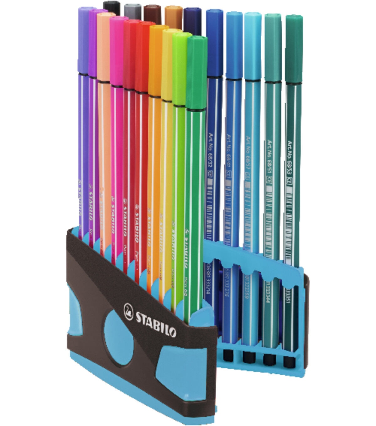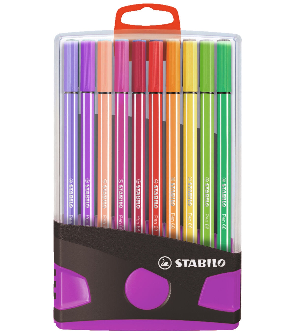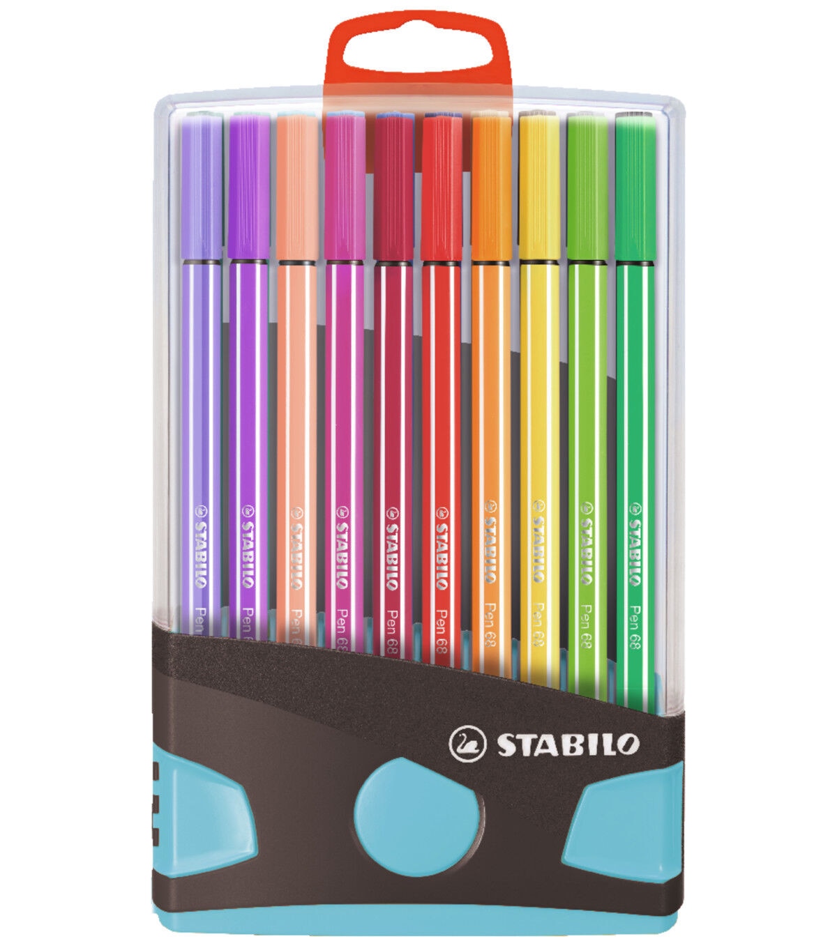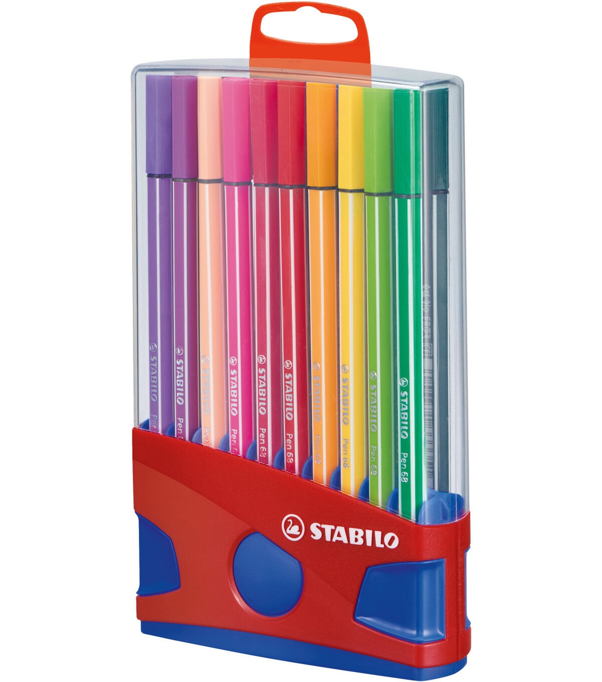 This sets includes 20 pens in vibrant colors that come in a convenient plastic case. The case folds out into a fun stand-up easel making it easier to choose pens and keep them organized. With their sturdy bullet tips and brilliant, intense colors, Pen 68 fiber tip pens are perfect for layout, detail and sketching. The odorless water-based ink will not bleed. It also will not dissolve toner or ink of permanent markers. Pens can be left without their cap for 24 hours without drying out.