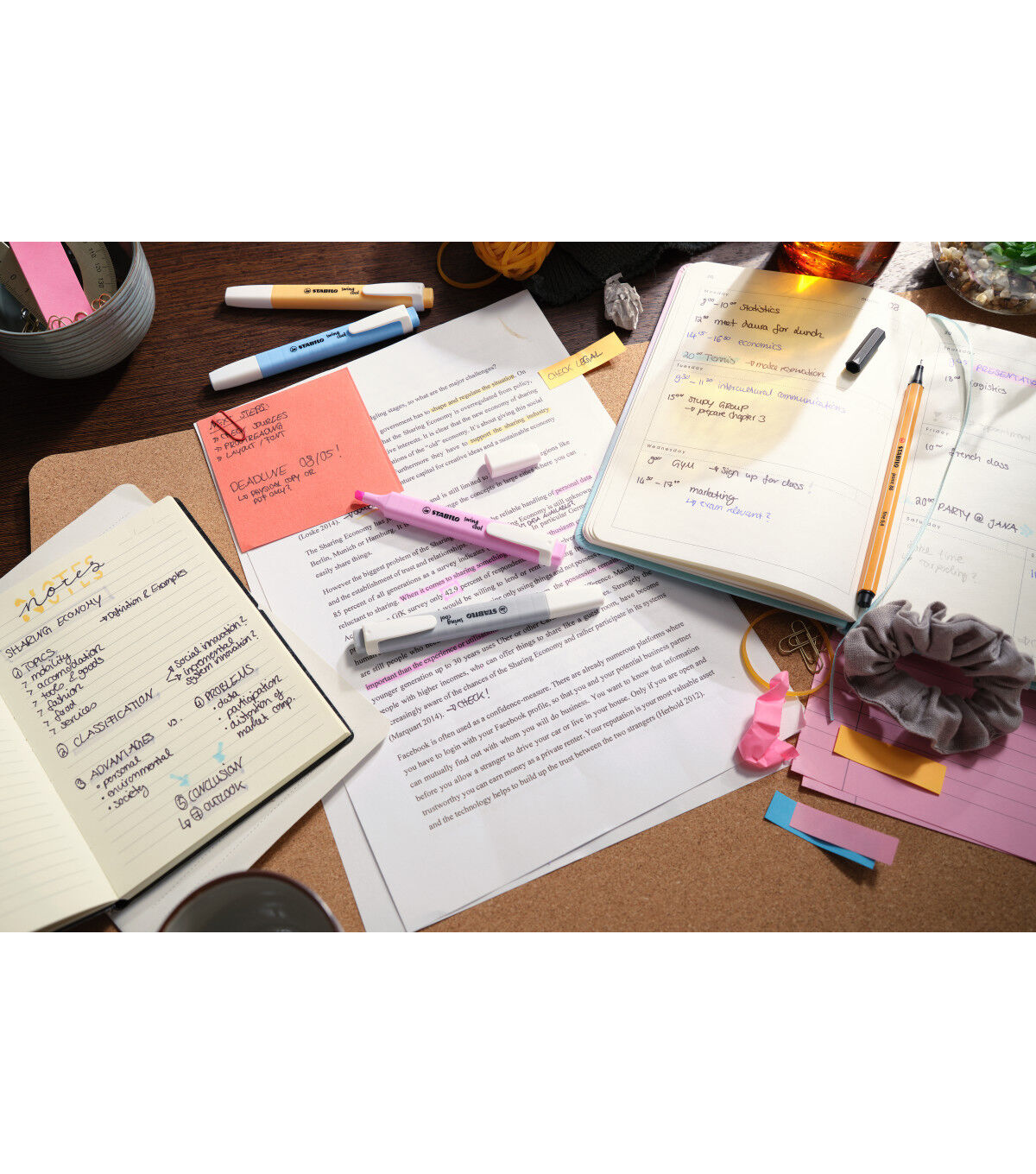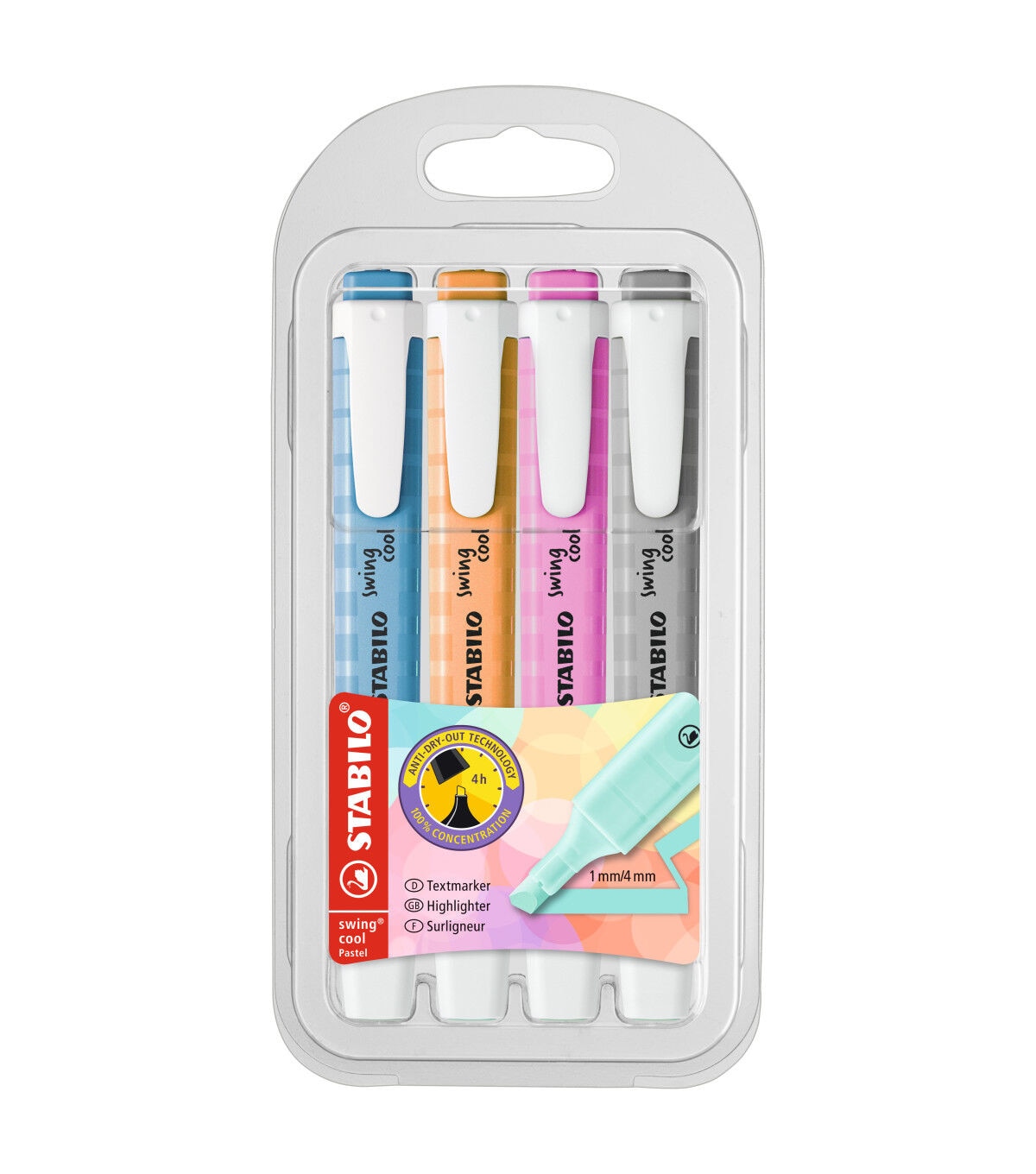 These flat, pocket-sized highlighters feature a glossy and striped look and a non-slip, matte-finish grip zone. The fluorescent and pastel, water-based inks are ideal for paper, copies and faxes.