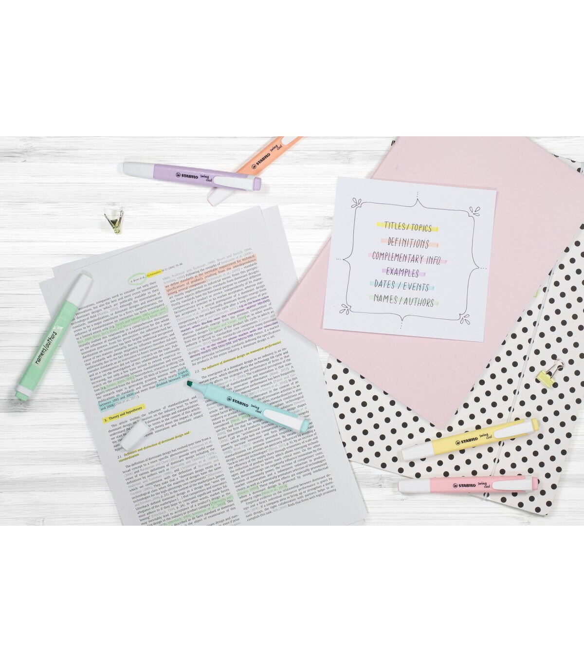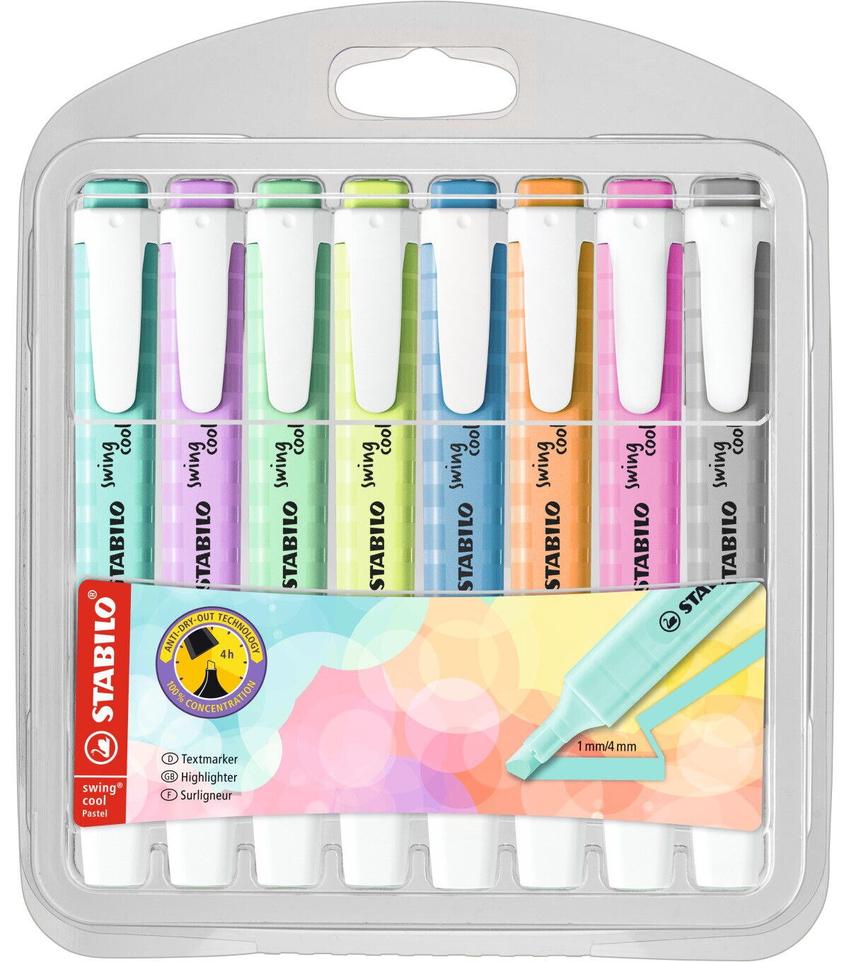 These flat, pocket-sized highlighters feature a glossy and striped look and a non-slip, matte-finish grip zone. The fluorescent and pastel, water-based inks are ideal for paper, copies and faxes.