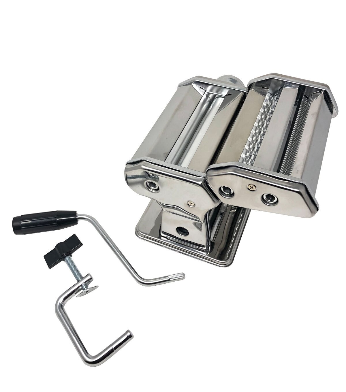 - Contains: Pasta Machine/Roller. Pasta Cutter Attachment. Removable Handle. Clamp