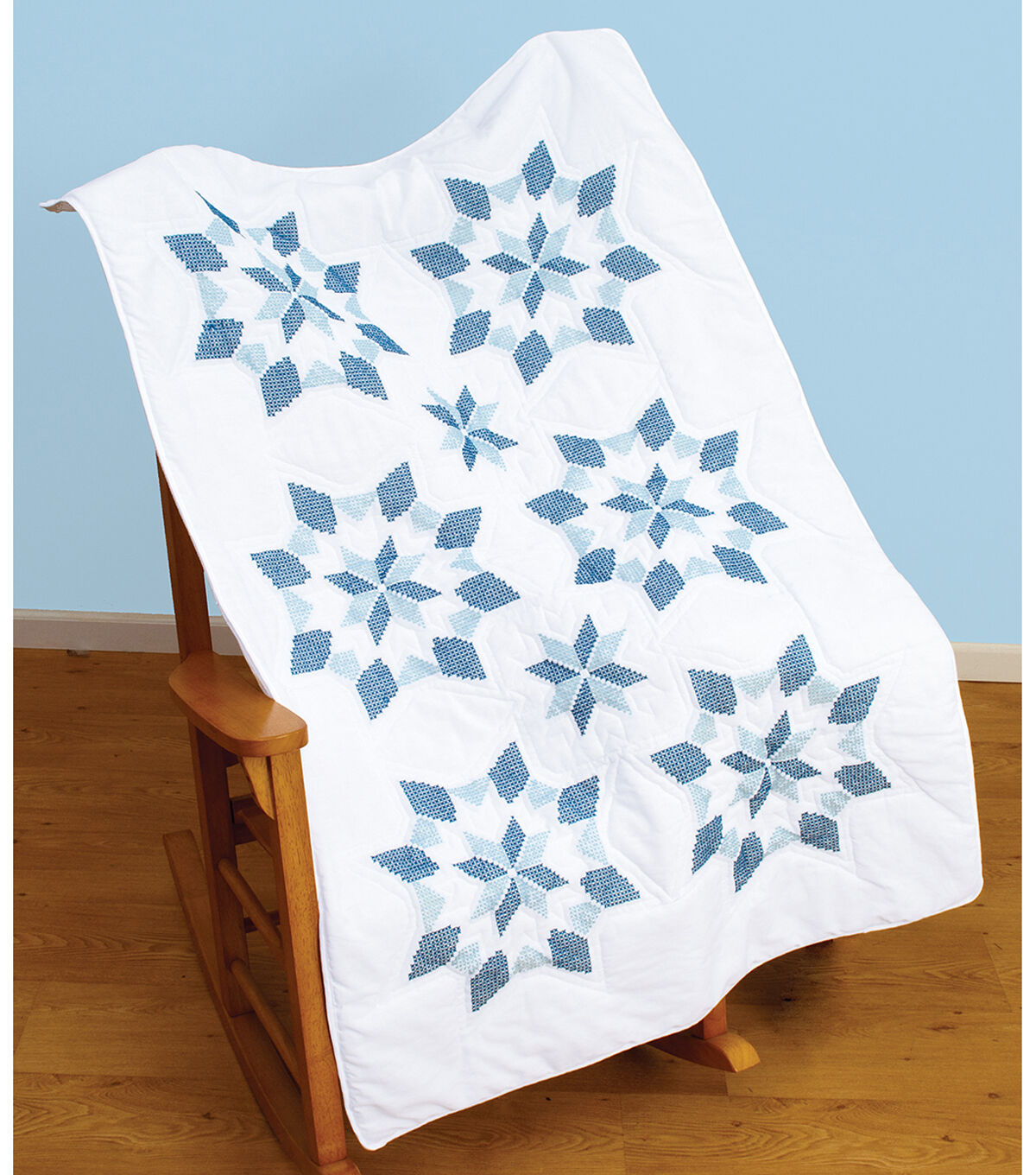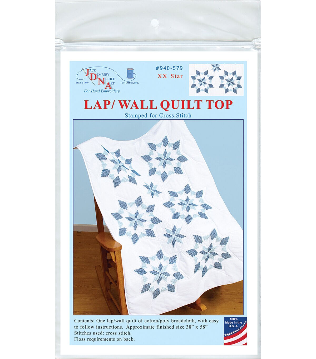 Jack Dempsey-Stamped White Lap Quilt Top. Create a beautiful wall or lap quilt using this great kit. The stitching designs have been stamped using ink that washes away with any liquid and the fabric is a cotton/poly blend broadcloth. This package contains one 40x60 inch wall/lap quilt, instructions for completion and care and a complete list of DMC floss requirements. Hoop, backing, batting, thread and needle sold separately. Design: XX Star. Made in USA.