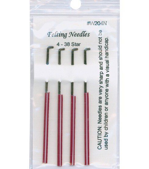 The 38 gauge star needle has four sides with barbs notched out. This is a finer needle that can pull fibers from four surrounding areas, while still leaving a smaller hole in the felted surface. It felts slower than the larger gauge triangle needles, but the detail is finer.
