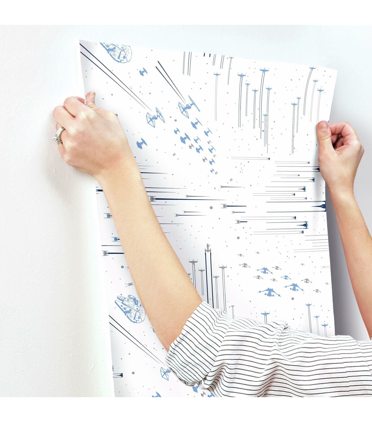 Set off into battle with the Star Wars: Galactic Battles Peel and Stick Wallpaper by RoomMates. Offering a fresh new alternative to decorating with very little commitment, use peel and stick wallpaper for more than just walls. Great for upgrading walls, furniture, DIY Crafts, décor and more, the decorating possibilities are endless. A fast, fun and affordable decorating tool, install peel and stick wallpaper in minutes. Just peel and stick! plus, remove in full strips in just seconds keeping walls 100% safe. Reusable and extremely versatile. 20.5 inches x 16.5 feet 20.5 Repeat. Drop Match. 28.18 square feet