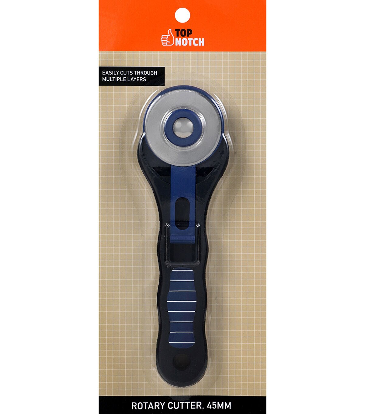 The Top Notch Stick Rotary Cutter 45 MM Blade is the perfect fabric cutting tool for precision cutting multiple layers of fabric and paper. Simply position either material and use this stick rotary cutter to cleanly cut through multiple layers with ease. With a rubberized comfort grip handle featuring ridges for superior control, this 45mm rotary cutter is as stylish as it is functional. Measuring approximately 6.9375” by 3.125”, this stick rotary cutter is designed symmetrically for easy maneuverability by both left- and right-handed users. The 45mm blade is crafted from stainless steel for durability and long-lasting sharpness. Use the retractable blade guard to keep the sharp 45mm blade securely protected for safe storage and always keep this rotary cutter as well as any cutting tools for sewing away from children for safety. Perfect for quilting, sewing, dressmaking, crafting and more, the Top Notch Rotary Cutter is a must-have precision cutting tool for any crafting, quilting, or sewing kit.