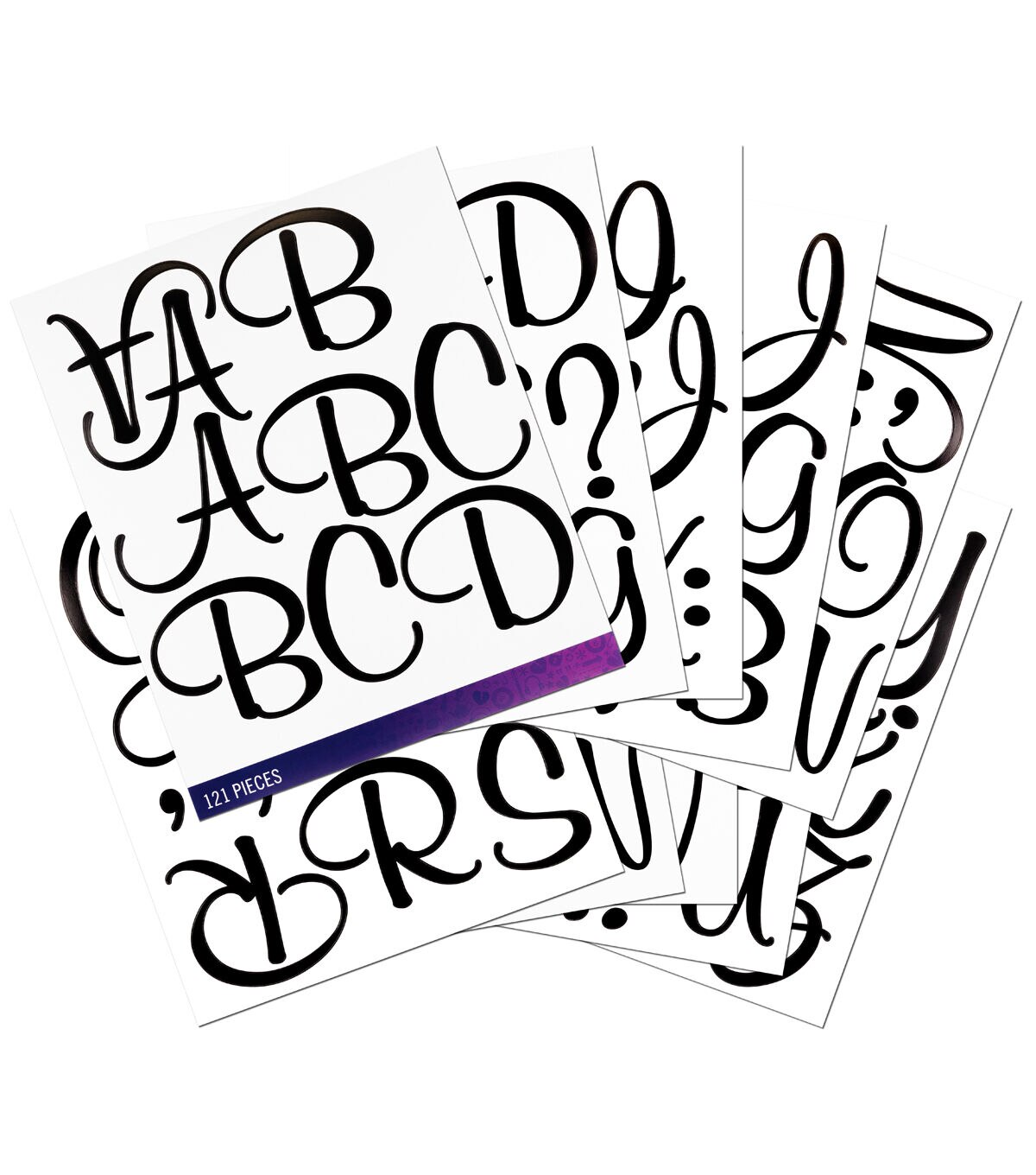 Add a spark to your creative projects with the Sticko Script Extra Large Alphabet Stickers-Black. This sticker pack includes the entire alphabet in all caps plus some punctuation marks. This letter style gives a great artistic look to monogram and framed projects, cards, gift tags and bags, signs and more. Simply peel and stick them onto your project media to add a personalized touch.