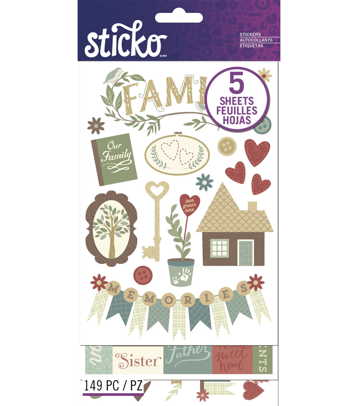The Sticko Flip Pack-Family Icons Words contains a broad range of stickers with unique styling and eye-catching designs. Available in a variety of sizes, colors and shapes, these stickers are versatile and ready to add to any project you like. Add a special touch to any card or craft project with these sparkly glitter stickers. The package contains 148 stickers.