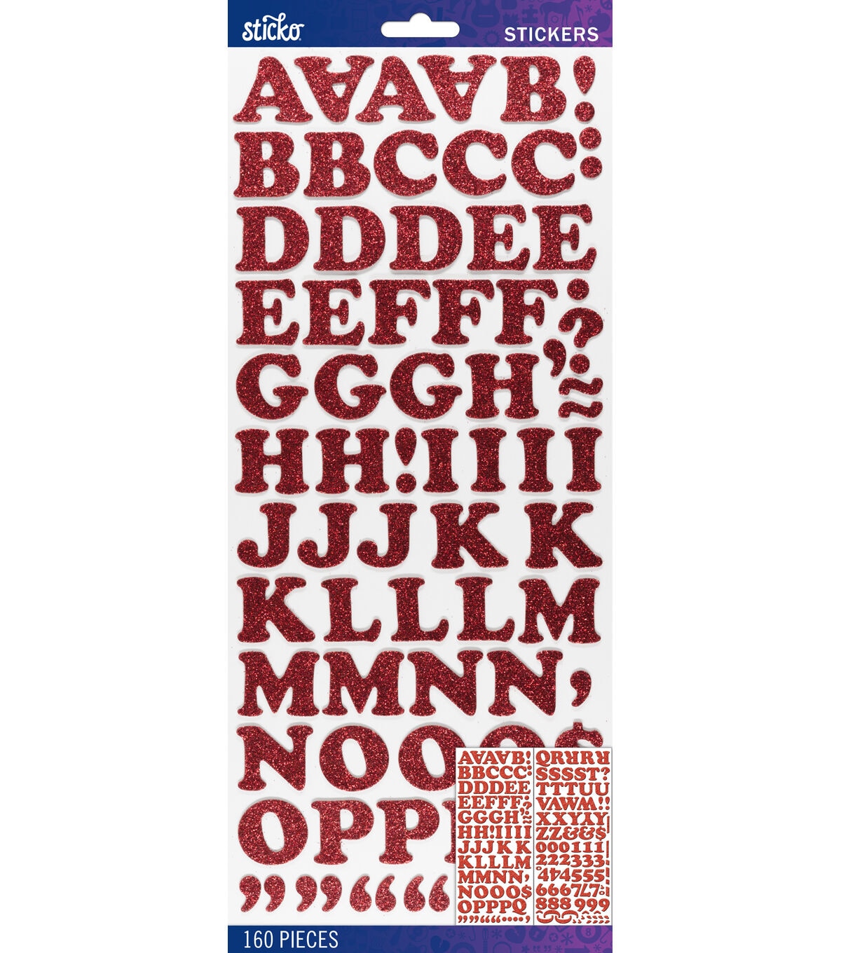 Add a spark to your creative projects with the Sticko Cooper Dimensional Glitter Alphabet Stickers-Red. This sticker pack includes the entire alphabet in upper case plus numbers and some punctuation. They're made from chipboard for a little dimension and glitter for a little razzle-dazzle. Simply peel and stick them onto your project media to add a personalized touch.