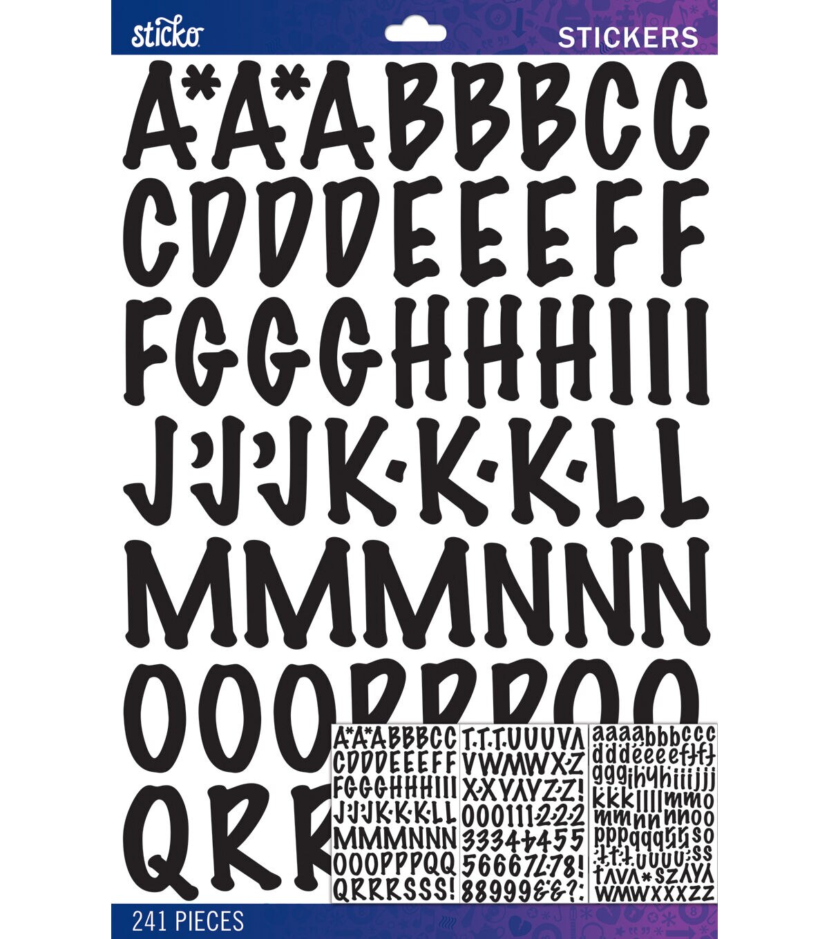 Add an element of fun and personalization to scrapbooks, paper crafts and more with the Sticko Marker Black Alphabet Stickers Large. These unique sticker embellishments feature alphabet, number and symbol designs in an eye-catching font and versatile color. Use them to embellish scrapbook or journal layouts, greeting cards, party invites, children's crafts, notebooks, photo albums, gift tags and other projects. This package contains 241 assorted sticker embellishments that can be used to spell out words, phrases, dates, names and more.