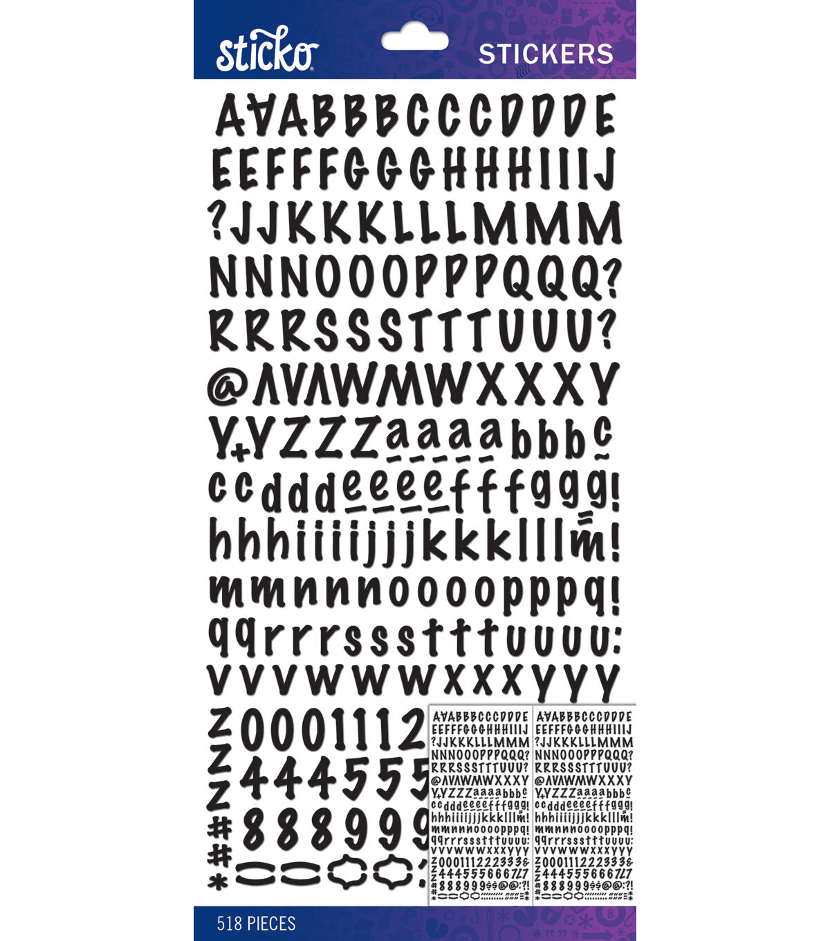 Add an element of fun and personalization to scrapbooks, paper crafts and more with the Sticko Marker Black Alphabet Stickers Small. These unique sticker embellishments feature alphabet, number and symbol designs in an eye-catching font and versatile color. Use them to embellish scrapbook or journal layouts, greeting cards, party invites, children's crafts, notebooks, photo albums, gift tags and other projects. This package contains 518 assorted sticker embellishments that can be used to spell out words, phrases, dates, names and more.