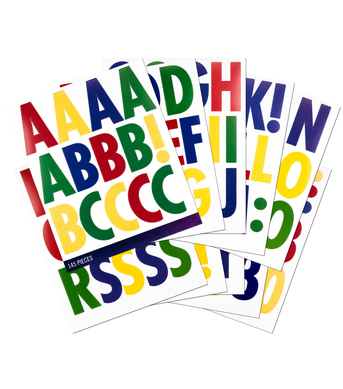 Add a spark to your creative projects with the Sticko Futura Regular Extra Large Alphabet Stickers-Primary. This sticker pack includes the entire alphabet in all caps plus numbers and some punctuation marks. The varied primary colors give a great artistic look to signs and posters. Simply peel and stick them onto your project media to add a personalized touch.