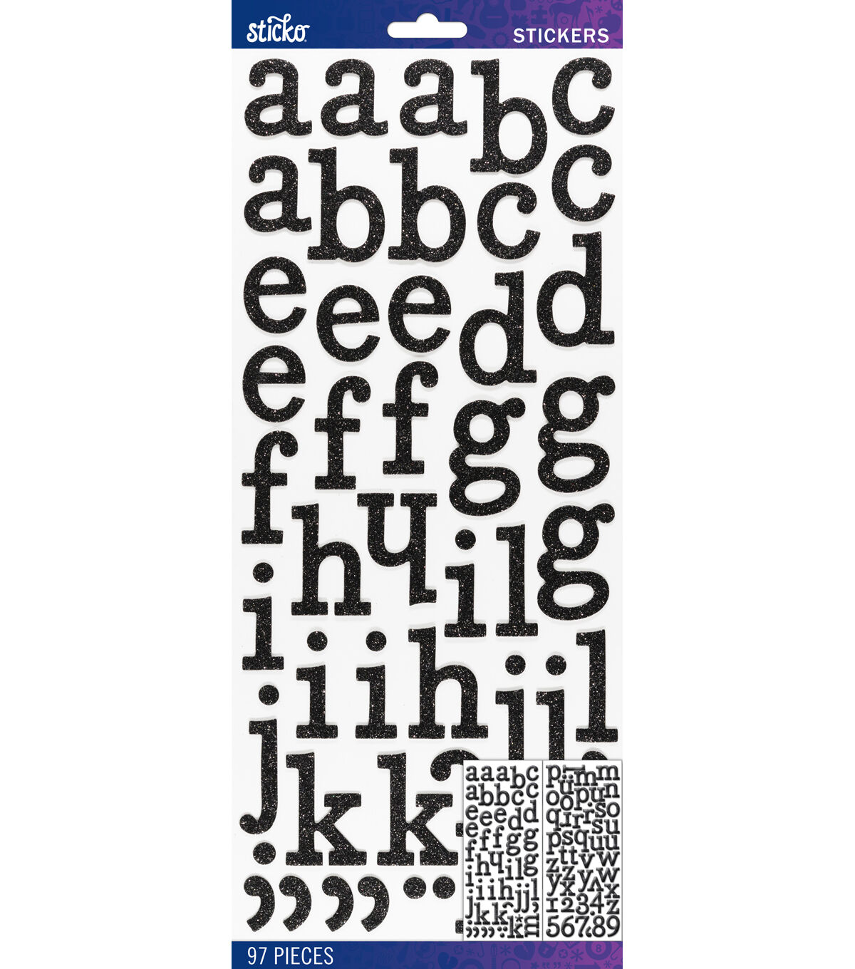Add a spark to your creative projects with the Sticko Glitter Egyptian Dimensional Alphabet Stickers-Black. This sticker pack includes the entire alphabet in lower case plus numbers and some punctuation. They're made from chipboard for a little dimension and glitter for a little razzle-dazzle. Simply peel and stick them onto your project media to add a personalized touch.
