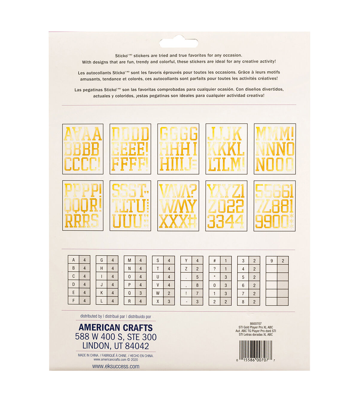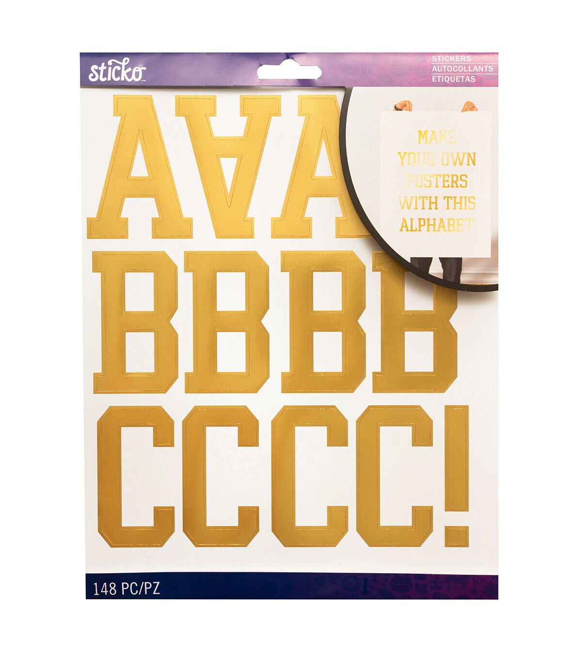 Create fun words, phrases, and more with Sticko alphabet stickers! They're perfect for scrapbooks, cards, home décor, posters, and so much more. This package includes 148 alphabet stickers in a shiny gold foil finish.
