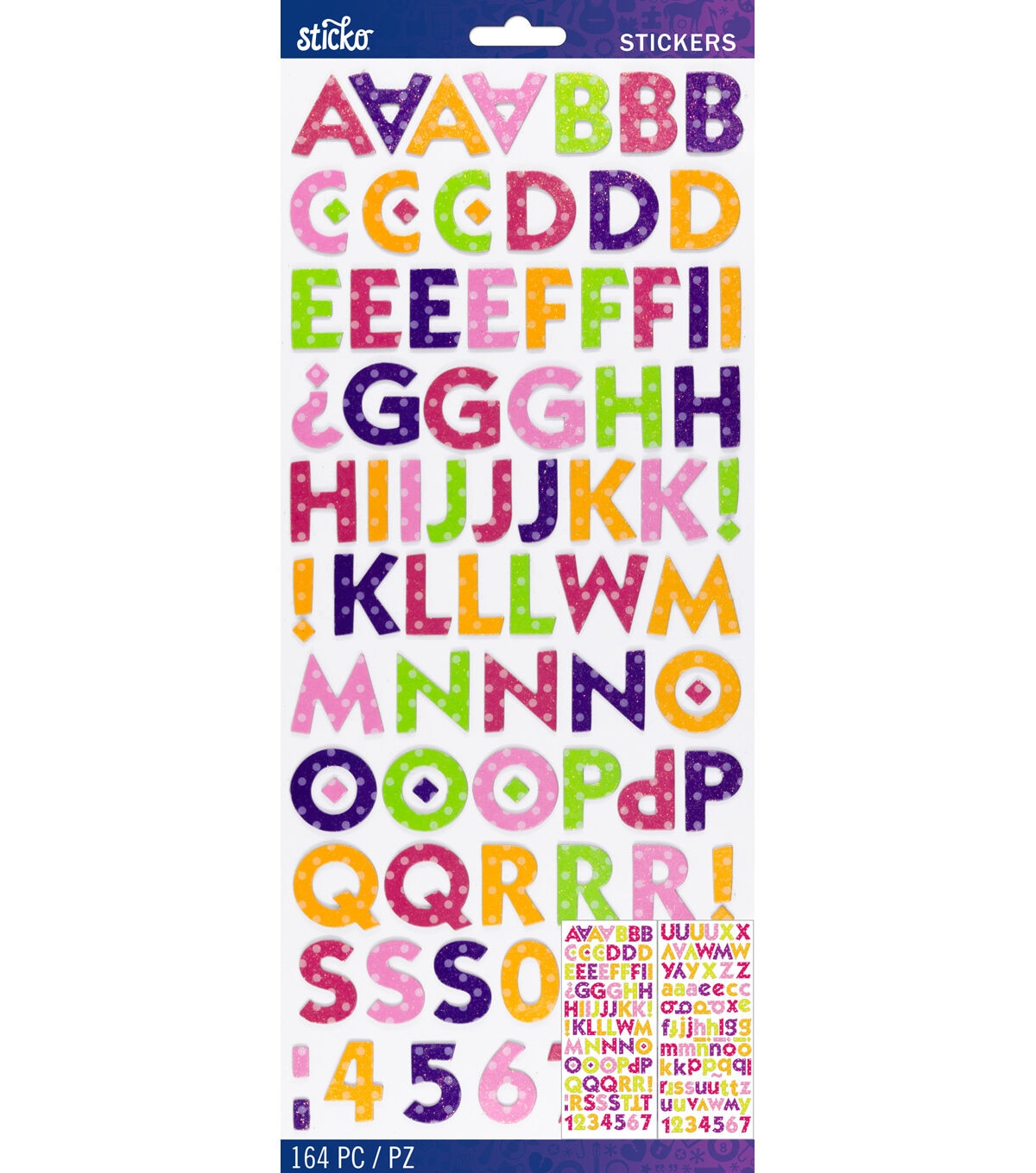 Add a spark to your creative projects with the Sticko Kable Medium Dimensional Alphabet Stickers-Multi Combo. This sticker pack includes the entire alphabet in upper and lower case plus numbers and some punctuation. They're made from chipboard for a little dimension and glitter for some razzle-dazzle. Simply peel and stick them onto your project media to add a personalized touch.