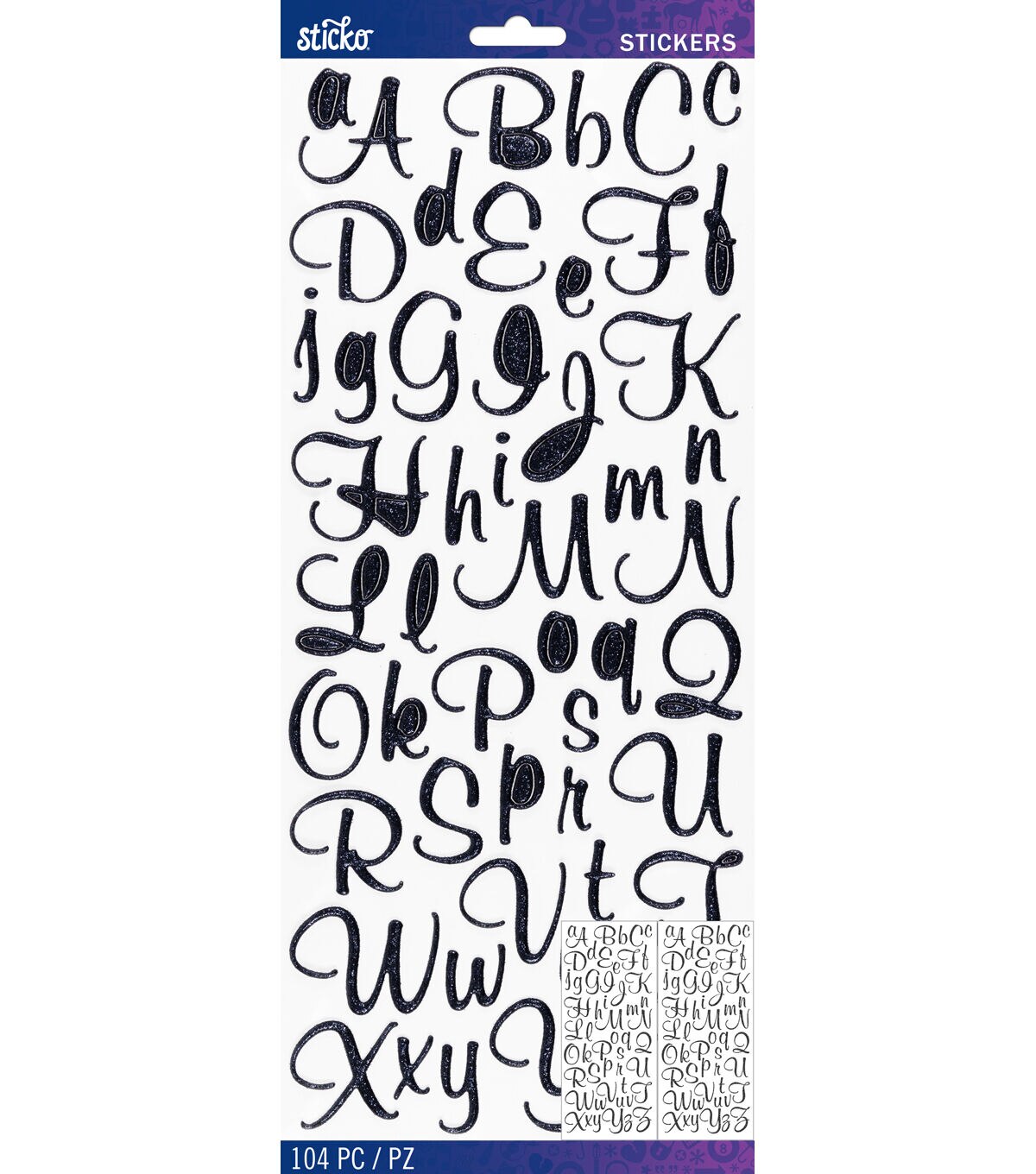 Add a spark to your creative projects with the Sticko Mural Script Dimensional Glitter Alphabet Stickers-Black. This sticker pack includes the entire alphabet in upper and lower case. The puffy style adds dimension on your gifts, cards, scrapbook pages, and more. Simply peel and stick them onto your project media to add a personalized touch.