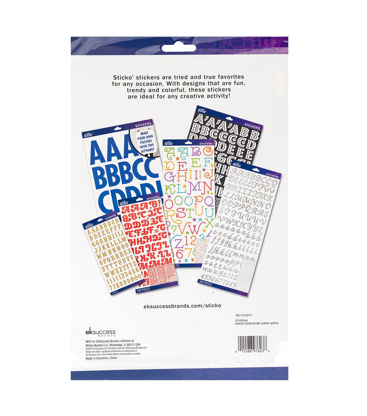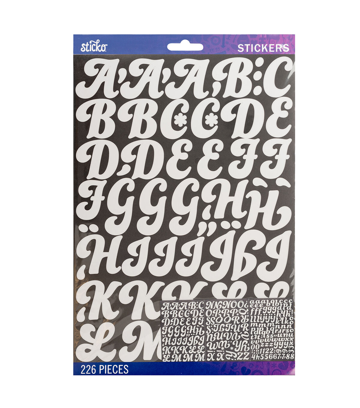 Add a spark to your creative projects with Sticko stickers! Sticko offers a broad variety of subjects and styles with a designer's eye for detail and trend. Our White Funkydori Large Alphabet Stickers include the entire alphabet in upper and lower case plus numbers and punctuation. Great for all your creative projects that want personalization.