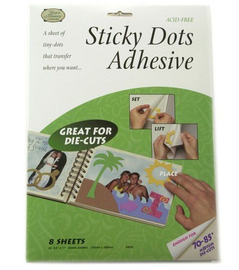 A self-adhesive dot designed to adhere two smooth, flat surfaces together. Fast & easy, no drying time and acid free.