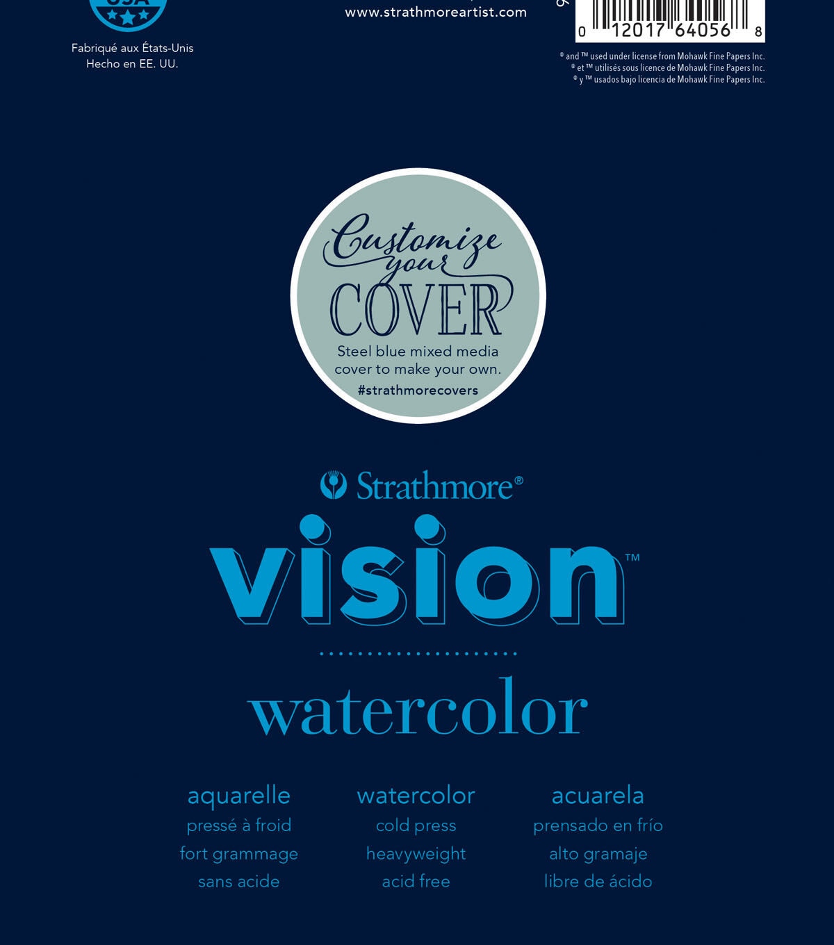 The Vision Watercolor Pad is a unique pad with a customizable cover. For the first time ever, we've added a blank, heavyweight cover made from high quality, steel blue mixed media paper for your art-- simply remove the protective fly sheet and explore the possibilities. Whether it's decorating in doodles, designs or colorful patterns, the customizable cover is ready for your art. The Vision Watercolor Pad features an economic heavyweight watercolor paper with a cold press finish that provides even washes and good lifts with wet media techniques. Featuring acid free paper, extra high sheet counts, sturdy chipboard backing, and extra durability, the tape bound 6 Inch x 9 Inch Vision Watercolor Pad with is perfect for creative and expressive artists. All Strathmore Vision products are proudly made in the U.S.A.