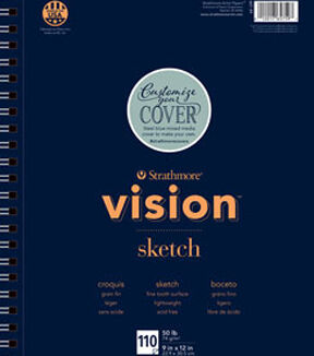 The Vision Sketch Pad is a unique pad with a customizable cover. For the first time ever, we've added a blank, heavyweight cover made from high quality, steel blue mixed media paper for your art-- simply remove the protective fly sheet and explore the possibilities. Whether it's decorating in doodles, designs or colorful patterns, the customizable cover is ready for your art. The Vision Sketch Pad features a lightly textured white sketch paper ideal for quick, dry media sketches using pencil, charcoal, sketching sticks, and pastels. Sheets are acid free and micro-perforated for clean and easy removal from the pad. Featuring an extra high sheet count, sturdy chipboard backing, and extra durability, the wire bound 9 Inch x 12 Inch Vision Sketch Pad is the perfect sketching pad for creative and expressive artists. All Strathmore Vision products are proudly made in the U.S.A.