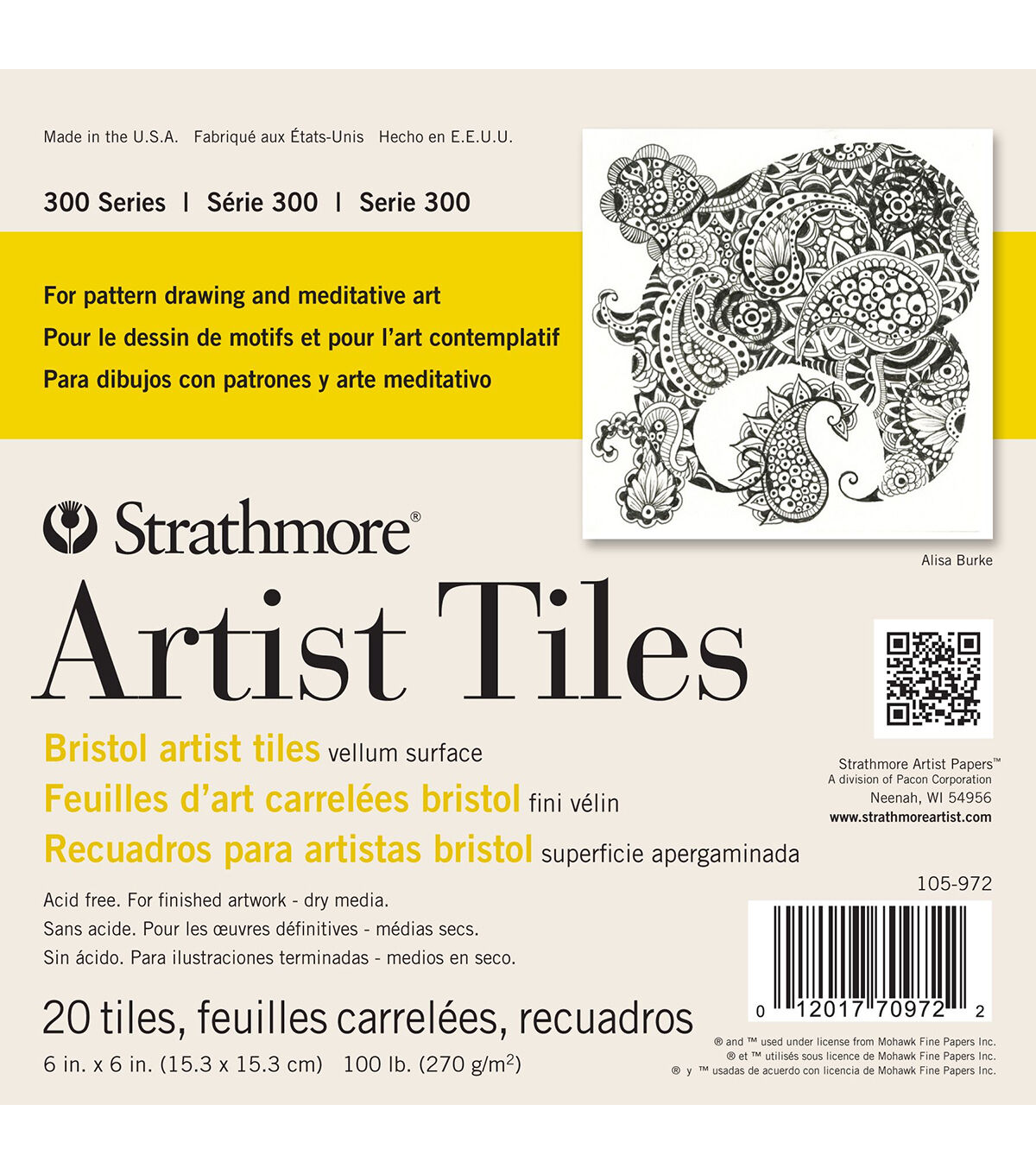 Strathmore-Artist Tiles: Bristol Vellum. Ideal for pattern drawing and meditative art, these affordable, pre-cut artist tiles help make the process of combining repetitive marks, circles, lines and forms both fun and easy to learn. This package contains twenty 6x6 inch sheets of artist paper. Acid free. Made in USA.