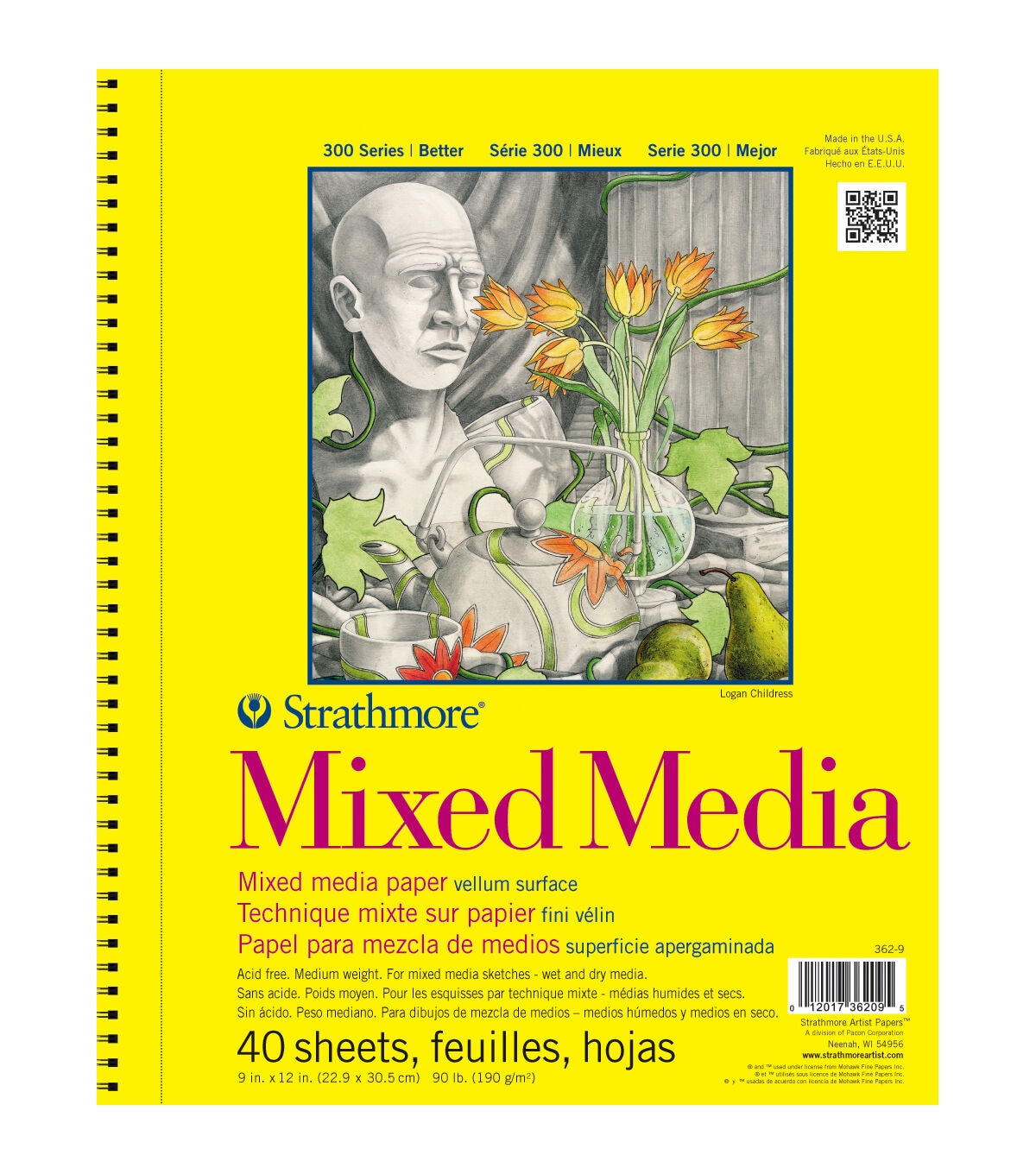 Pro Art-Strathmore Mixed Media Vellum Paper Pad. A medium-weight paper with a vellum surface ideal for mastering wet and dry media techniques. This package contains one 12x9 inch spiralbound mixed media pad with forty sheets of 90lb acid free vellum papers. Made in USA.