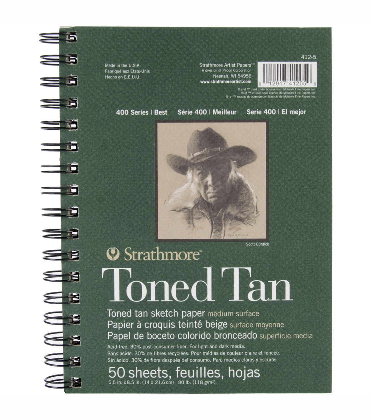 Hone your art skills on the go with the Pro-Art Strathmore Spiral Toned Sketch Book. The sketch book comes with 50 tan sheets of paper to make wonderful sketches and drawings. Artists can create well-defined light and dark sketches on the sketch book's medium surface. It's also lot easier to remove finished pages with the sketch book's spiral binding.